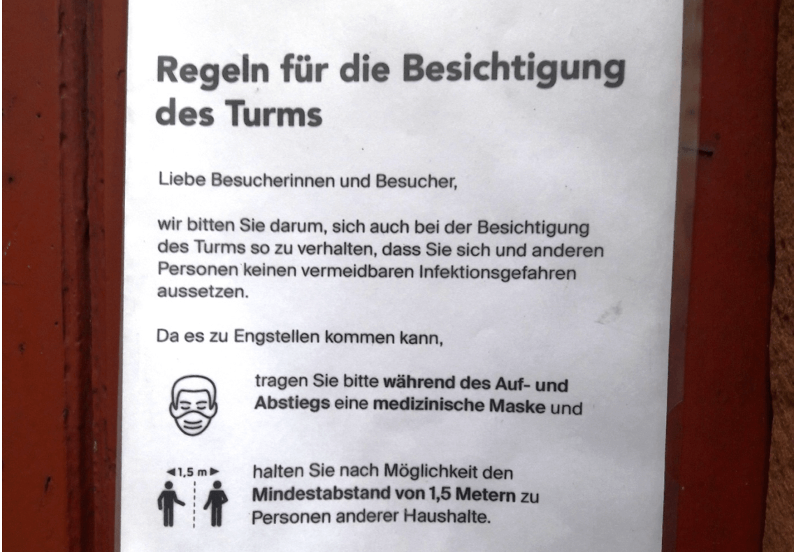 Am Eingangstor zur Turmbesichtigung, vor dem Durchgang zur Burg, hängt noch ein Schild mit den Regeln zur Turmbesteigung, die vor „3G“ gültig waren. Das beweist, dass es jetzt nicht mehr um unsere Gesundheit geht, sondern um Impfdruck. Auch Geimpfte sind langfristig nicht vor diesem Druck sicher; sie könnten ohne dritte Impfung bald wieder zu Ungeimpften werden, wie in Israel.