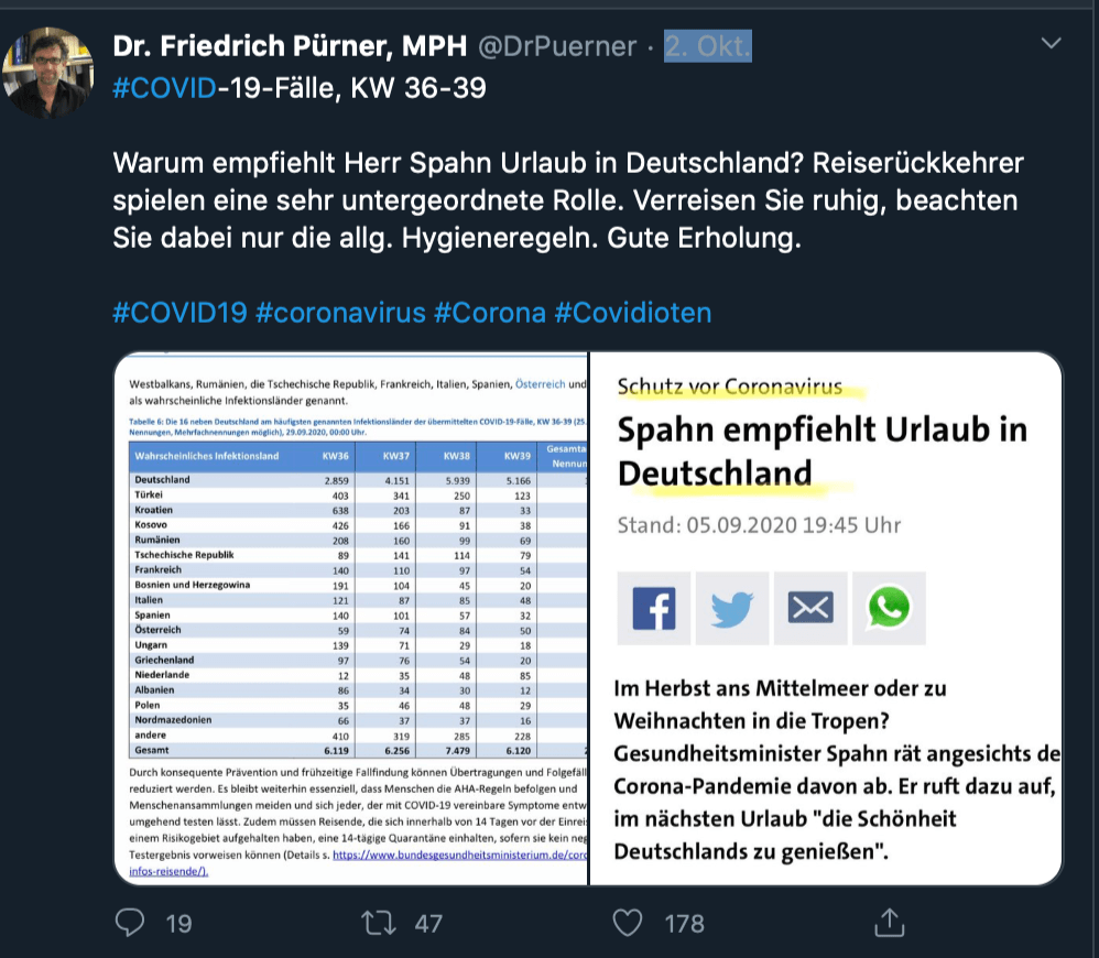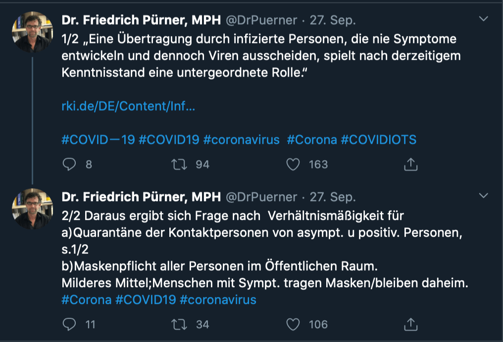 So schrieb er in dem sozialen Netzwerk etwa: „Mund-Nasen-Schutz im Freien nicht nötig. Gebührender Abstand (ohne Maßband) ist auch in Innenstadt möglich. Ansteckungsgefahr im Freien ist deutlich geringer als im geschlossenen Raum. Aufklärung statt Verbote!“ Auch Gesundheitsminister Jens Spahn dürfte sich nicht freuen über den kritischen Mediziner aus der Amtsstube: