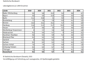 Zunächst zu den Fakten: Die Geburtenrate in Deutschland ist seit 2021, dem letzten Jahr ohne nennenswerten Einfluss der sogenannten „Impfstoffe“, von 9,7 Lebendgeburten pro 1.000 Einwohner auf nur noch 8,1 im vergangenen Jahr 2024 gesunken, in diesem Zeitraum also um 16,5 Prozent zurückgegangen. In den Jahren zuvor bewegte sich eben diese Quote auf einem sehr konstanten Niveau mit ganz leichten Schwankungen nach oben oder nach unten – so wie man es unter normalen Voraussetzungen auch erwarten würde. Dieser Trend lässt sich nicht nur für Deutschland insgesamt ablesen, sondern war in praktisch allen Bundesländern auf ganz ähnliche Weise abzulesen.