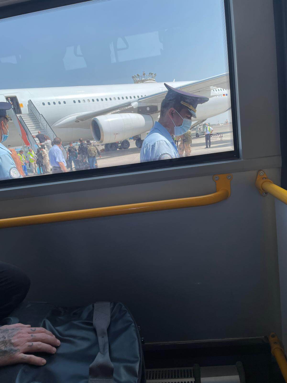 Die haben dann das Flugzeug hinten aufgemacht, wie das bei diesen Militärflugzeugen funktioniert. Da waren dann schon Busse und Personal von Usbekistan. Die Busse haben uns dann zum Terminal gebracht, da wurden nochmal die Rucksäcke und Koffer kontrolliert.