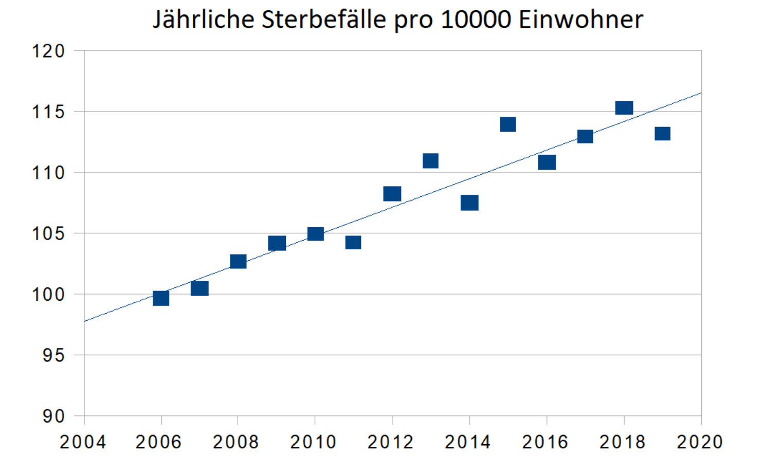 Das Resultat ist zunächst wenig überraschend. Nimmt man den Anstieg der Bevölkerungszahl genauer ins Visier, so ist tatsächlich anzunehmen, dass auch die Gesamtanzahl der Sterbefälle genauer abgeschätzt werden kann und in jedem Fall steigen wird. Ganz so einfach ist die Lage aber nicht, denn immerhin wäre die Gesamtanzahl über die Jahre selbst dann angestiegen, wenn die Anzahl der Sterbefälle pro 10.000 Einwohner einigermaßen konstant geblieben, die Bevölkerung selbst aber gewachsen wäre. Die Daten zeigen aber, dass selbst die relative Anzahl der Sterbefälle ein klares lineares Wachstum aufweist, das mit der wachsenden Bevölkerung allein nicht zu klären ist.