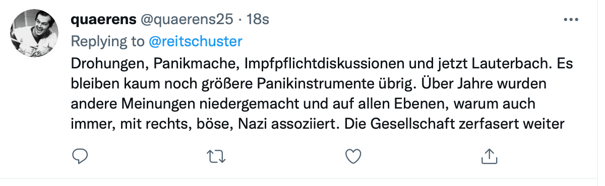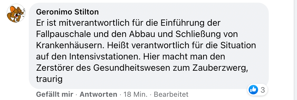 Dieser Tweet auf Facebook, Twitter und den anderen sozialen Netzwerken war meine erste Reaktion auf die Ankündigung, dass der Sozialdemokrat Karl Lauterbach tatsächlich Gesundheitsminister werden wird. Mein Eindruck von der persönlichen Begegnung mit ihm: Ich würde ihm keinen Gebrauchtwagen abkaufen. Erstens, weil ich massive Zweifel hätte, in welchem Zustand der ist. Zweitens, weil ich kein Vertrauen habe. Mehrfach hatten wir Belege dafür hier auf der Seite, dass dieses Misstrauen begründet ist (siehe die Artikel: „(Selbst-)Entlarvung: Wie manipulativ Lauterbach mit Daten und Realität umgeht. Wie der SPD-Politiker Fakten verdreht“ oder „Kein ‘studierter Epidemiologe‘ und auch kein Professor für Epidemiologie“). Lauterbach ist mitverantwortlich für die Krise des Gesundheitssystems, die uns dahin brachte, wo wir jetzt sind. Er ist DER Scharfmacher und Spalter in der aktuellen Krise. Erst am Sonntag sagte er über Andersdenkende bei Anne Will: „Das sind Menschen, die haben diese Achtung nicht verdient.“ Lauterbach hat auch schon eine Art Lockdown fürs Klima ins Gespräch gebracht. Ich bin sonst eher zurückhaltend, was solche Aussagen angeht, aber hier muss ich es sagen, wenn auch diplomatisch verblümt: Ich habe bei Lauterbach manchmal Zweifel an seiner Zurechnungsfähigkeit. Er wirkt regelmäßig wie auf Droge und verhält sich auffällig. Der Eindruck hat sich verfestigt, dass er für ein Amt nicht taugt, von seiner dubiosen Lobbytätigkeit gar nicht zu reden. Seine Ernennung zeigt die Hilflosigkeit von Olaf Scholz. Sie macht mich sprachlos. Deshalb lasse ich die Leser sprechen – hier ein Video-Tweet und die bemerkenswertesten Kommentare auf meinen obigen Post.