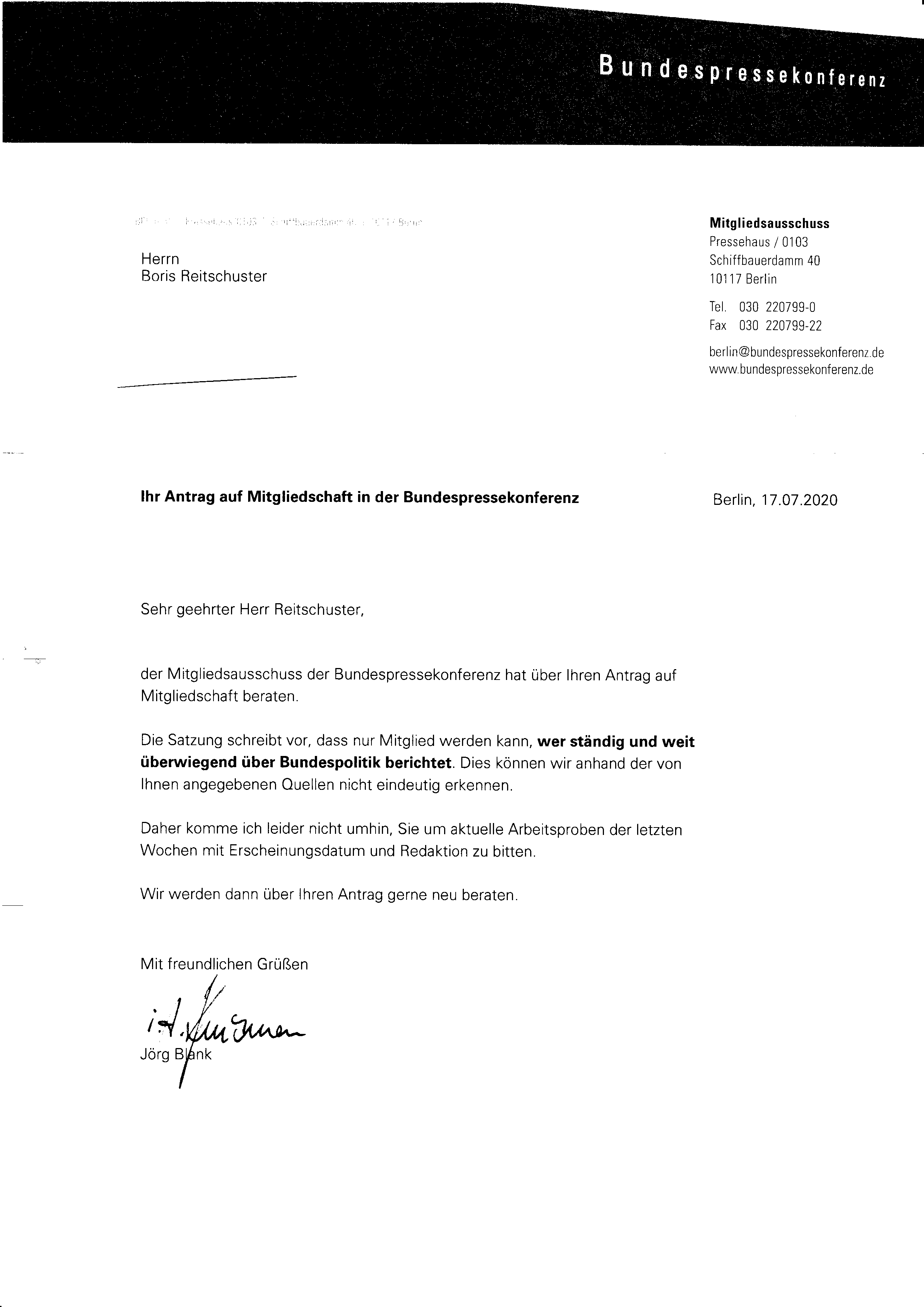 Umso überraschter war ich, als jetzt ein Brief von der Bundespressekonferenz kam, in dem es hieß, man könne meinem Aufnahmeantrag nicht entsprechen. Wörtlich steht in dem Schreiben: „Der Mitgliederausschuss der Bundespressekonferenz hat über Ihren Antrag auf Mitgliedschaft beraten. Die Satzung schreibt vor, dass nur Mitglied werden kann, wer ständig und weit überwiegend über Bundespolitik berichtet. Dies können wir anhand der von Ihnen angegebenen Quellen nicht eindeutig erkennen.“