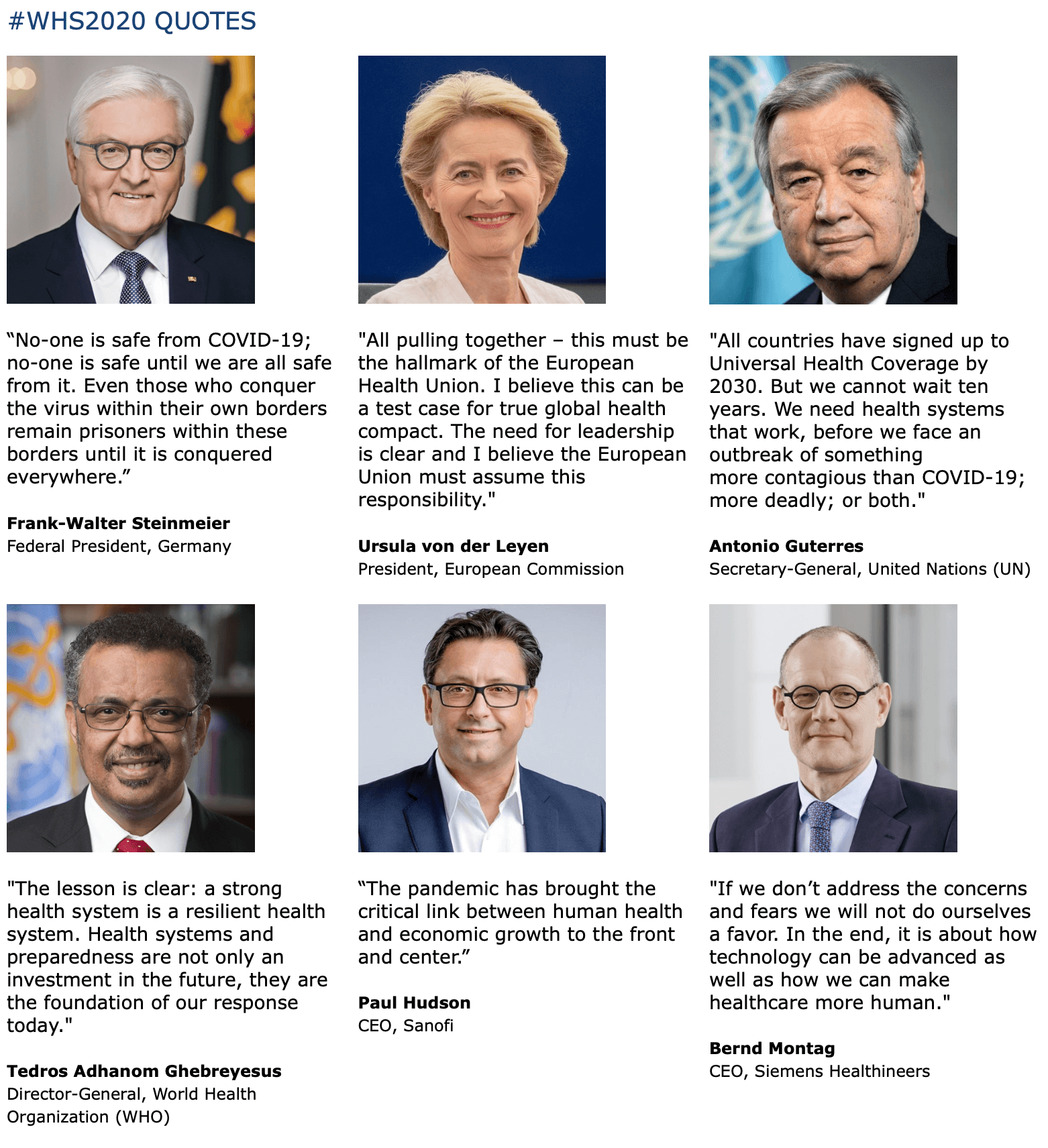 Bei einer so hochkarätigen internationalen Konferenz will man natürlich positiv rüberkommen (nicht Sars-Cov-2-positiv) und so wird aus der Niederlage, die wir derzeit im größten Feldversuch der Geschichte, was eine Pandemie betrifft, erleben, doch noch ein Sieg für die Zukunft gemacht. Resiliente Gesundheitsysteme (WHO), eine gut verlinkte Gesundheitsökonomie (Sanofi) und der technologische Fortschritt (Siemens) werden uns in eine blühende globale Gesundheitswelt katapultieren und jedes virale Elend von uns fern halten.