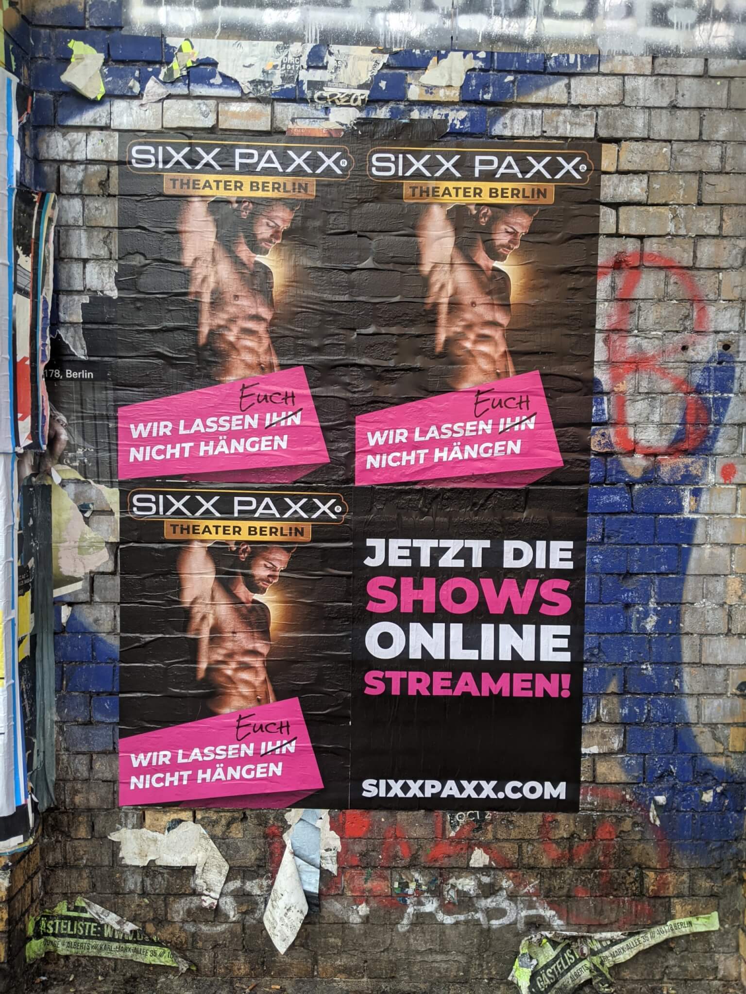 Da hängen Plakate. Ein Privattheater wirbt für sein Programm: Online ab 19 Uhr im Stream.