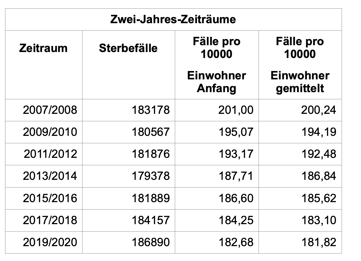 In den beiden Jahren 2007 und 2008 sind somit insgesamt 183.178 Menschen verstorben. Gemessen an den zu Beginn des Jahres 2007 vorhandenen Einwohnern sind das 201,00 Sterbefälle pro 10.000 Einwohner. Verwendet man als Basisgröße nicht die Einwohnerzahl zu Beginn des Zeitraums, sondern den Durchschnitt der Einwohnerzahlen aus 2007 und 2008, erhält man in der letzten Spalte 200,24 Sterbefälle pro 10.000 Einwohner. Welchen Basiswert man nimmt, spielt aber keine Rolle, denn man sieht deutlich, dass die relative Sterblichkeit in Zwei-Jahres-Zeiträumen kontinuierlich sinkt, auch noch im Zeitraum 2019/2020. Die erhöhte absolute Sterblichkeit des Jahres 2020 ist also mit der Entwicklung der Bevölkerungszahlen und dem Nachholeffekt aufgrund des sehr milden Jahres 2019 vollständig erklärbar.