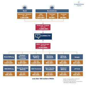 Rund 2,6 Millionen Euro aus Bundes- und Landesministerien. Allein aus Nordrhein-Westfalen: 1,3 Millionen. Dazu über 17 Millionen von angeblichen „Nichtregierungsorganisationen – darunter die Open Society Foundation, Google, Omidyar/Luminate. Und über 100 weitere.