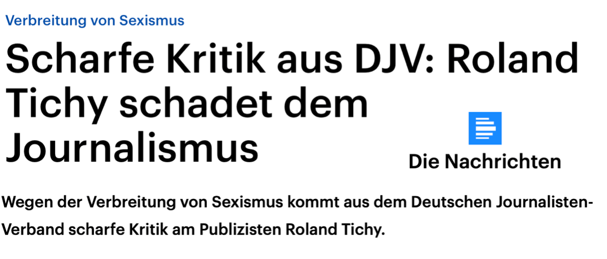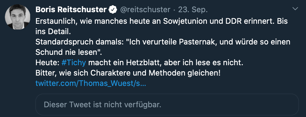Umso erschreckender ist es für mich, diese Aussage und die Denkweise heute in Deutschland wieder zu erleben. „Sein Hetzblatt lese ich nicht“, schreibt etwa der Unternehmer Thomas Wüst auf Twitter über den Journalisten Ronald Tichy: