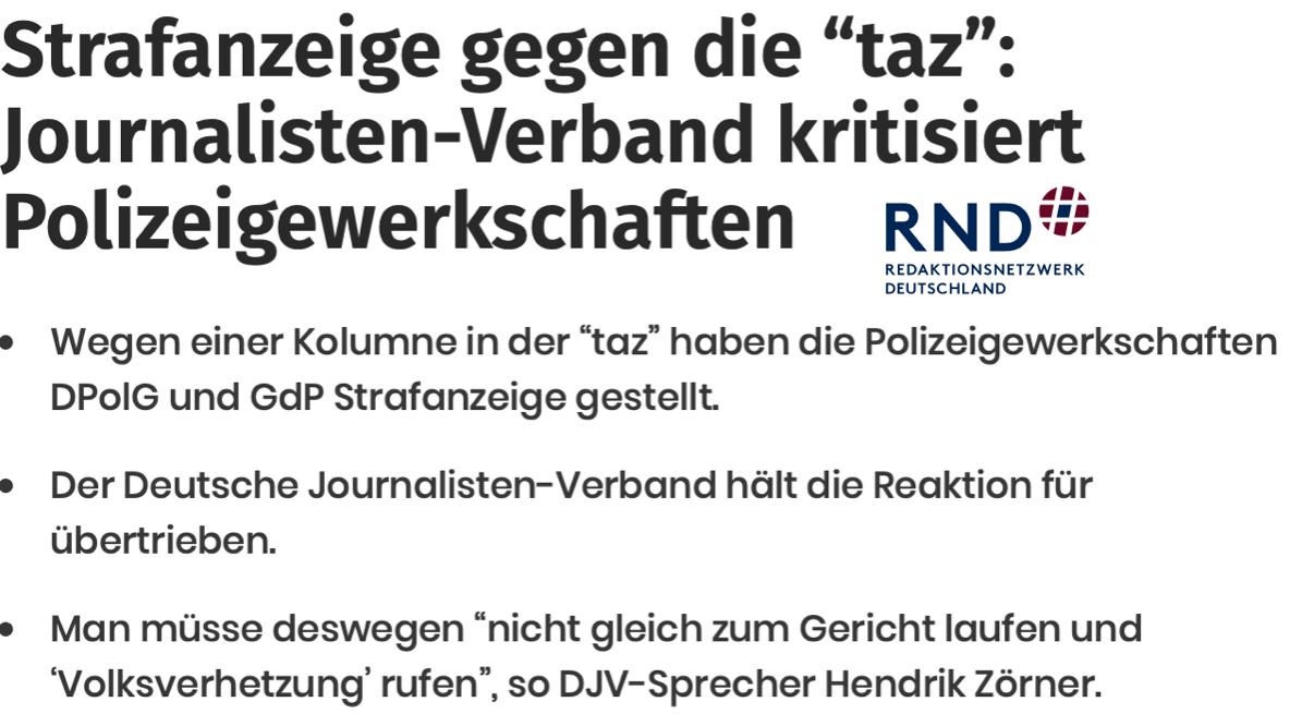 Daraus zu konstruieren, dass die gut besoldete Swasan Chebli „Opfer von Frauenhass“ sei, halte ich für gewagt. Ich zweifle, dass die Attacke etwas mit ihrem Geschlecht zu tun hat. Richtig wäre: Sie ist Opfer von sehr bissigem, geschmacklosen Spott geworden. Unter der Gürtellinie. Und den müssen heute viele ertragen. Was nicht schön ist. Wir haben gerade erlebt, wie Hengameh Yaghoobifarah in der taz forderte, Polizisten auf der Müllhalde zu entsorgen. Die gleichen linken Dauer-Empörten hatten daran mehrheitlich nichts auszusetzen. Umso mehr empörten sie sich, als sich andere darüber empörten. Hier ein Beispiel – die Reaktion des „Deutschen Journalisten-Verbandes“, der von einem ehrenwerten Berufsverband zu einem linken Polit-Organ wurde (weswegen ich austrat):