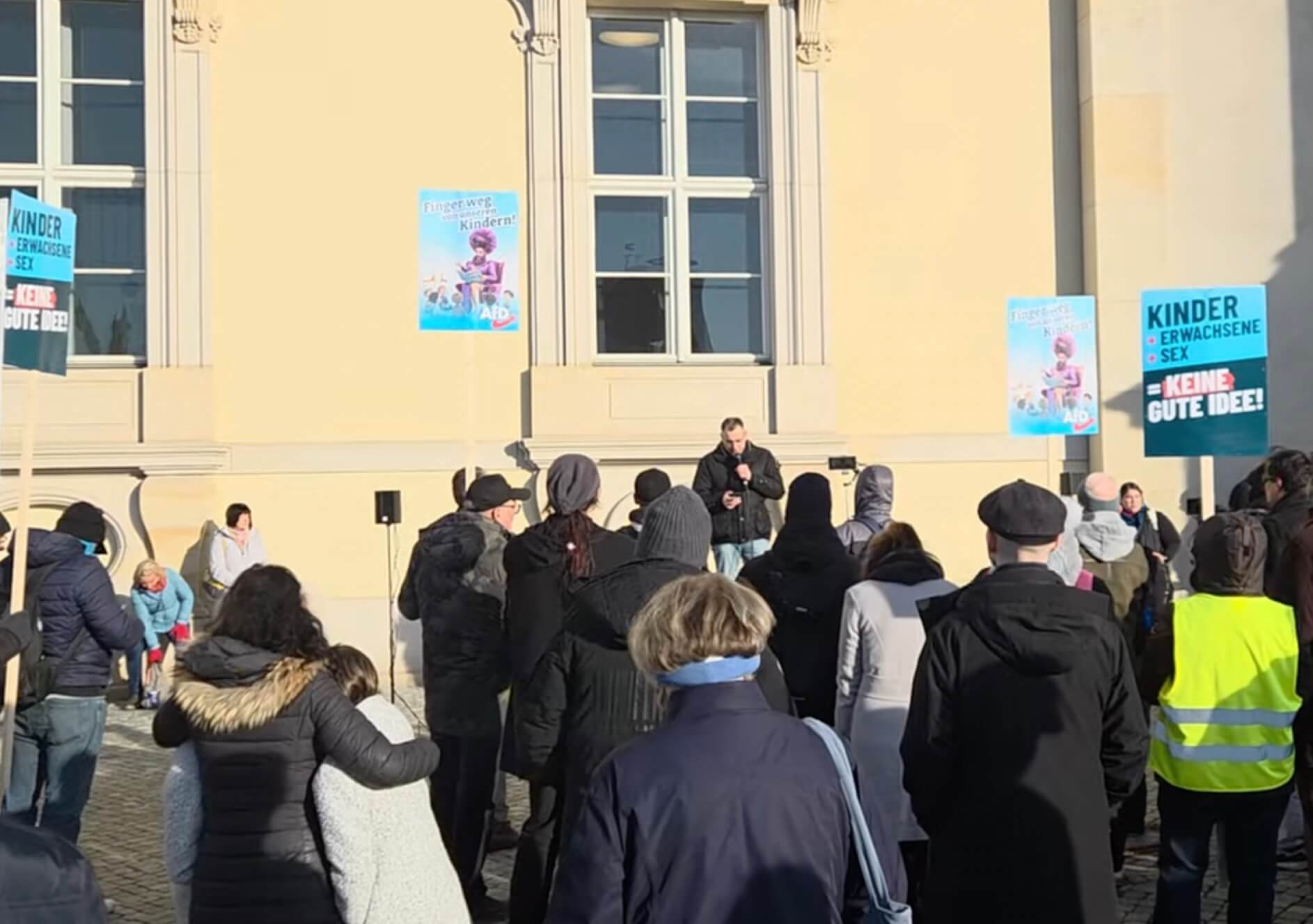 Die Berliner AfD hatte bereits im Vorfeld ihren Protest zum Ausdruck gebracht und für Sonntag auch eine Demo vor Ort angekündigt. Die Partei verurteilte die Bilderbuch-Lesung der Drag Queens als „queere Propaganda im Kinderzimmer“ und sieht darin eine Art der „frühkindlichen Sexualisierung“. Postwendend wurde von den üblichen Verdächtigen eine Gegenveranstaltung mit Menschenkette geplant und unter das Motto „bunt, laut, solidarisch“ gestellt.