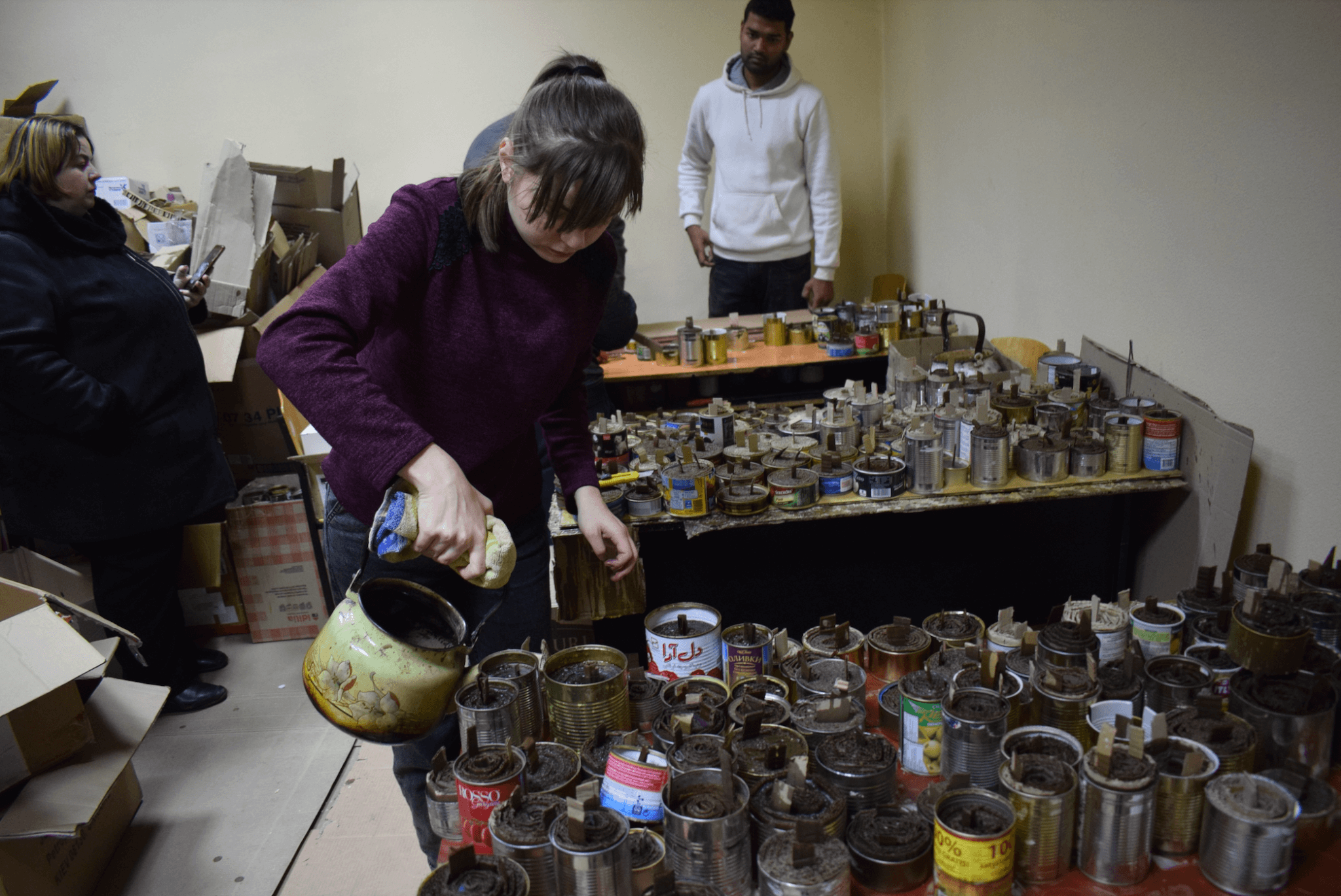 In die mit Kartonage vollgestopften Konservendosen wird erhitztes flüssiges Paraffin geschüttet. Zwei Pappstreifen dienen als Docht. Wenn man die Dose jetzt anzündet, gibt sie nicht nur Licht, sondern über Stunden auch Wärme. Wichtig für einen Winterkrieg.