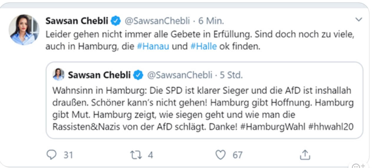 Heftig tobt die Agitations-Schlacht auch in den sozialen Medien, allen voran auf twitter. Es ist unglaublich, wie gerade diejenigen, die sich am lautesten über „gruppenbezogene Menschenfeindlichkeit“ empören, genau diese an den Tag legen – und das offenbar nicht einmal merken. Die Sozialdemokratin Sawsan Chabli, Staatssekretärin und oft spöttisch Twitter-Beauftragte der rot-rot-grünen Berliner Regierung genannt, unterstellt, die Wähler der AfD würden die Massaker von Halle und Hanau gut finden:
