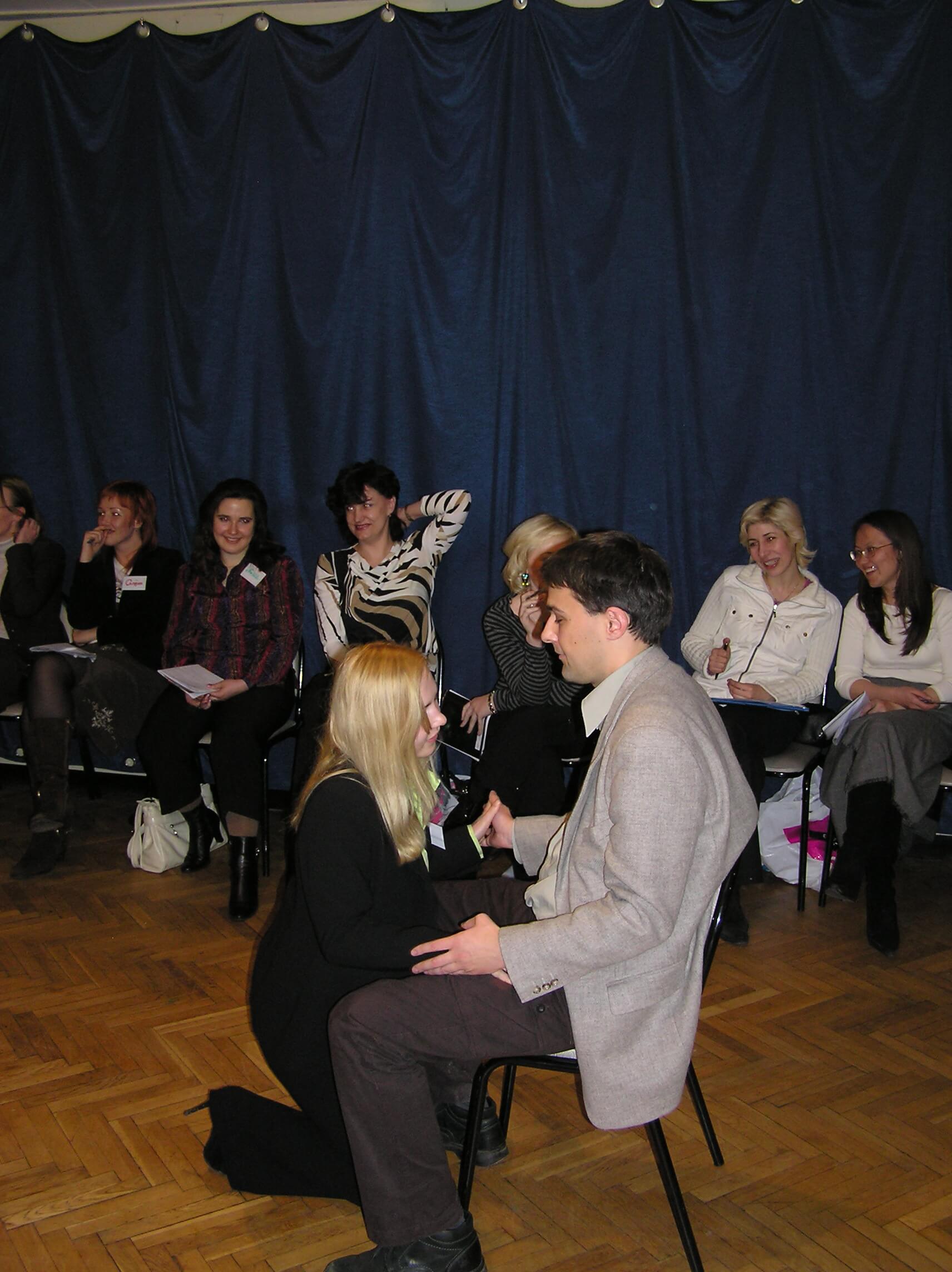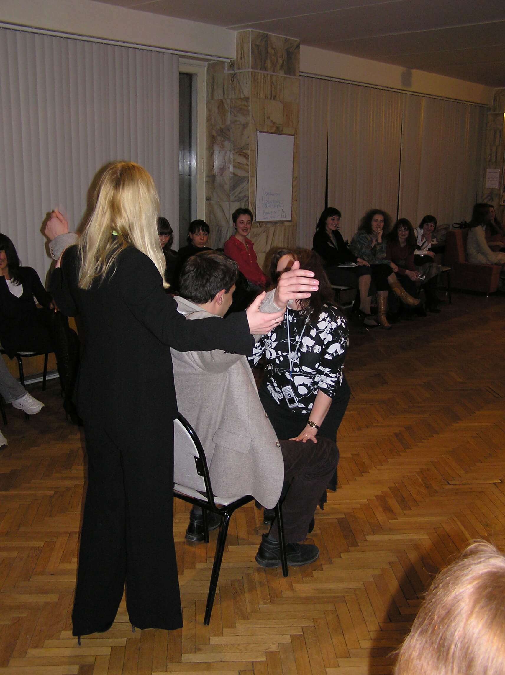 „Haben nicht Männer Unterricht und psychologischen Beistand viel notwendiger?“, frage ich Rakowskij nach der Stunde. „Ja, aber sie sind weniger veränderungsfähig als Frauen“, antwortet er: Es ist leichter, eine Straßenlampe in Bewegung zu bringen, als die meisten Männer. Eine der jungen Frauen kommt auf mich zu, mit gezücktem Notizblock und ratlosen Augen. „Bitte, erklären Sie mir die Männer!“, sagt sie traurig. Ich lasse den Kopf hängen: „Dazu müssten wir uns erst selbst verstehen.“