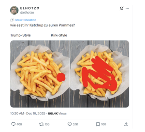 Ich sehe davon ab, dass er es nicht fertig brachte, den zweiten Teil der Überschrift korrekt über dem zweiten Bild zu positionieren, von Böhmermann-Mitarbeitern darf man nicht zu viel erwarten. Der „Trump-Style“ bezieht sich offenbar auf das Trump-Attentat, mit dem er anscheinend immer noch nicht fertig geworden ist, und das Ketchup soll das Blut auf dem damals getroffenen Ohr symbolisieren. Wie muss ich dann den „Kirk-Style“ verstehen? Der konservative politische Aktivist Charlie Kirk wurde vor einigen Monaten im Verlauf einer Veranstaltung auf dem Gelände der Utah Valley University angeschossen und erlag kurz darauf seinen Verletzungen. Das Attentat auf Trump führte nur zu vergleichsweise wenig Blut, der Anschlag auf Kirk, der in den Hals getroffen wurde, war ungleich blutiger. Kann man diesen Post von Hotz anders interpretieren als ein sich lustig Machen über zwei blutige Attentate, deren eines tödlich geendet hat? Wer das kann, soll es tun; ich kann es nicht.
