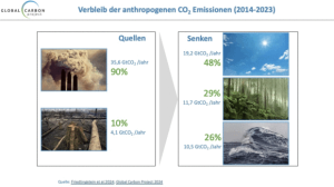 Das Bundesverfassungsgericht hat in seinem Beschluss von 2021 zum Klimaschutzgesetz festgelegt, dass bis zu einer Nullemission in 2050 insgesamt nur 6,7 Milliarden Tonnen CO2 ausgestoßen werden dürften. Diese Zahl ist aus einer Schätzung des IPCC abgeleitet worden, wonach insgesamt nur noch 800 Milliarden Tonnen CO2 ausgestoßen werden sollten. 800 multipliziert mit dem Bevölkerungsanteil Deutschlands von 0,84 % ergibt 6,7 Milliarden Tonnen. Zum Vergleich : Die heutige jährliche Emission Deutschlands beträgt ca. 0,6 Milliarden Tonnen. Diese Mengenbegrenzung bis 2050, so das Gericht, wäre nötig, um den Temperaturanstieg auf 1,75 °C zu begrenzen. Bei dieser Berechnung macht das Gericht schwere wissenschaftliche Fehler. Es behauptet: „Nur kleine Teile der anthropogenen Emissionen werden von den Meeren und der terrestrischen Biosphäre aufgenommen…Im Gegensatz zu anderen Treibhausgasen verlässt CO2 die Erdatmosphäre in einem für die Menschheit relevanten Zeitraum nicht mehr auf natürliche Weise. Jede weitere in die Erdatmosphäre gelangende…CO2 Menge erhöht also bleibend die CO2-Konzentration und führt entsprechend zu einem weiteren Temperaturanstieg“(Rn 32, S.31 des Beschlusses(siehe auch Lüning/Vahrenholt, Unanfechtbar). Wer die obige Grafik des IPCC-nahen Global Carbon Project liest, ist schockiert, wie ein Bundesverfassungsgericht ohne Kenntnis der naturwissenschaftlichen Grundlagen von Quellen und Senken des CO2 einen für Deutschland so existenziell wichtigen Beschluss fassen konnte.