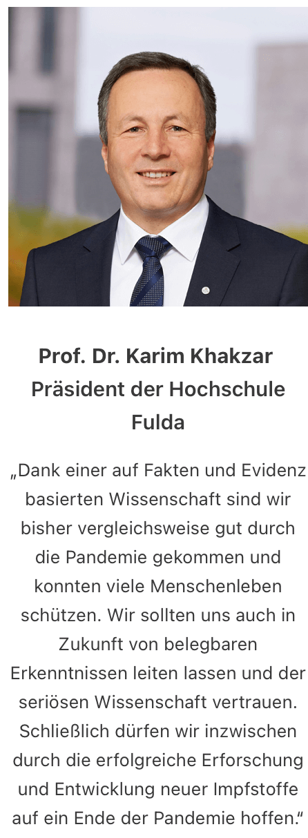 Dieser Tage erreichte mich via Twitter folgender Leserbrief: „In Fulda haben Bischof, Klinikleitungen sowie diverse Vertreter aus Politik und Wirtschaft – scheinbar unter Führung der Hochschule Fulda bzw. deren Präsidenten – die Initiative „Fulda zeigt Haltung“ ins Leben gerufen, bei der man online unter öffentlich einsehbarer Angabe von Vor- und Nachnamen (!!!) „Haltung“ in der Coronakrise zeigen soll. Bei den Details geht es natürlich jenseits eines wirklich fachlichen Diskurses vor allem gegen vermeintliche ‘Coronaleugner‘ und es wird klar gesagt: ‘Erst wenn 60 bis 70 Prozent der Bevölkerung durch Impfungen Immunität erhält, gilt die Pandemie als überwunden.‘ Da die Hochschule federführend scheint (siehe Impressum), haben in der „Liste der Teilnehmenden“ natürlich auch viele Professoren unterzeichnet. Wer sich nicht namentlich dazu bekennt, macht sich natürlich verdächtig!“