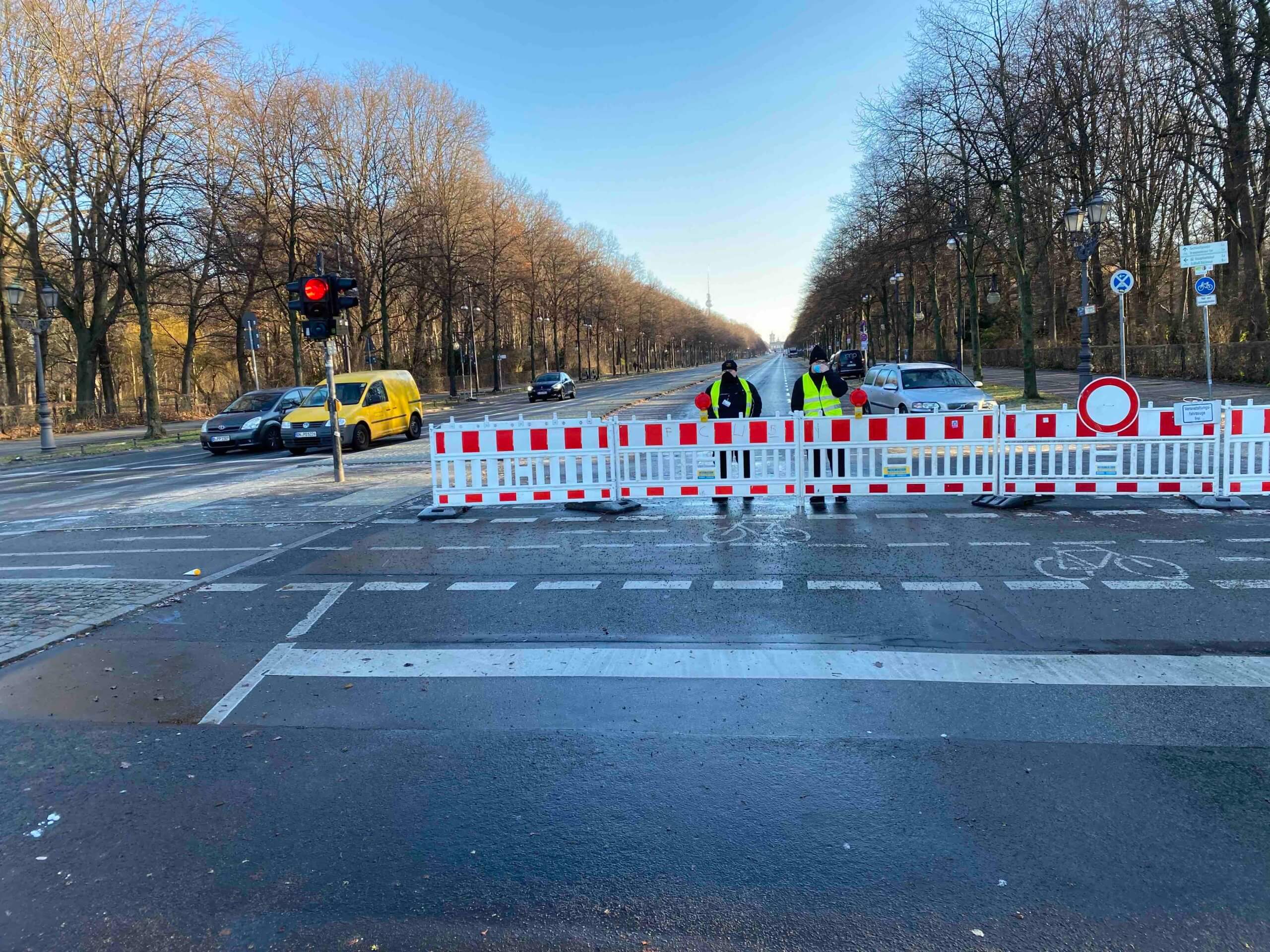 Auch die Polizei bestätigte diese Angaben. Auf die Frage, warum der Bereich so weiträumig abgesperrt sei bis hin zur Siegessäule, antwortete eine sehr freundliche Polizeisprecherin, dies habe verkehrstechnische Gründe. Man wolle im vorderen Bereich Staus verhindern, wenn von der mehrspurigen Prachtstraße nur noch ein Abbiegen in eine einspurige Querstraße möglich sei. Klingt logisch, auch wenn in Berlin in diesen Tagen verhältnismäßig sehr wenig Verkehr herrscht. Und auch die Ausweichstraße einspurig ist. Und warum dann auch explizit alle Parkplätze am Fahrbahnrand frei gemacht werden müssen. Und warum seit heute Mittag auf Radfahrer und Fußgänger nicht mehr durch dürfen. Aber sei’s drum.