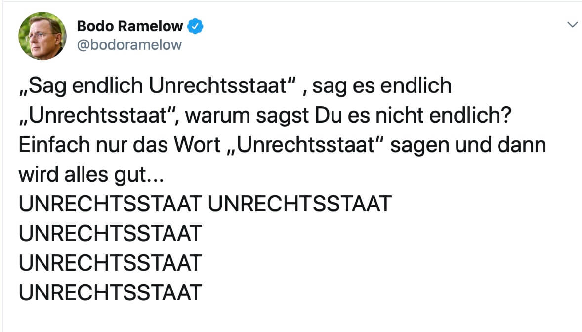 Dank der Blockierung durch Ramelow sah ich einen neuen Tweet von ihm erst heute. Schlimmer als in diesem Beitrag kann man die unzähligen Opfer der DDR- und SED-Diktatur, die Mauertoten, die Häftlinge in Bauzen und Hohenschönhausen, die aus Ostdeutschland in Stalins GULAGS deportierten Menschen kaum noch verhöhnen. Dass dieser Hohn von Ramelow haargenau zu dem Zeitpunkt kommt, als eine große linke Koalition ihn und seine Partei weichspült, ist besonders bemerkenswert. Es wirkt so, als wollten sie, dass die Nicht-Linken diese Kröte wissentlich schlucken müssen.