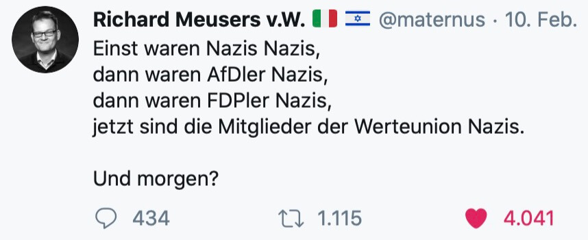 Tatsächlich haben wir es mit einem stillen Putsch zu tun: Der anti-totalitäre Grundkonsens, einer der Pfeiler unserer freiheitlich-demokratischen Ordnung, wird gerade zerstört, um der Sicherung einer linken Mehrheit willen. An seine Stelle soll ein anti-faschistischer Grundkonsens treten, in dem linke, teilweise linksradikale Kräfte definieren, was faschistisch ist. Inzwischen wird ja auch die FDP als „nazistisch“ diffamiert, und als nächstes ist die Werteunion an der Reihe, die CDU-Politiker bereits als „Krebsgeschwür“ bezeichneten. Besonders dramatisch ist, wie viele Politiker versuchen, das Krokodil zu füttern, oder es zu überzeugen, dass sie kein schmackhaftes Futter sind („Ich bin kein Nazi“), statt das Problem zu benennen und Grenzen zu ziehen.