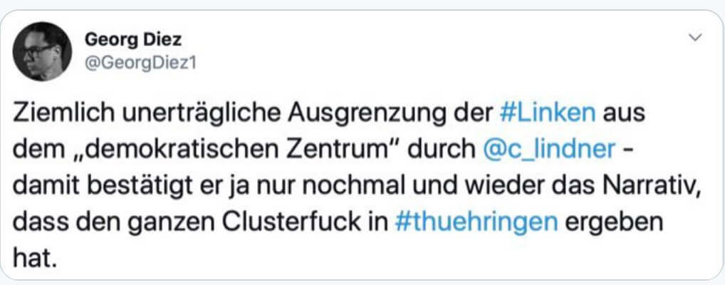 Wir haben in Deutschland 2020 eine Situation, in der der linksradikale Schwanz – mit stillschweigender Unterstützung von Kanzlerin und Präsident – mit dem Hund wedelt: der Mehrheit und Mitte der Bevölkerung.