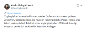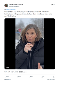 Auch Göring-Eckardt verwendet nach wie vor die Plattform X, obwohl X inzwischen dem Gottseibeiuns Elon Musk gehört und an linksorientierter Zensur keine Freude mehr hat. Am 4. Februar hat sie sich wieder einmal geäußert.
