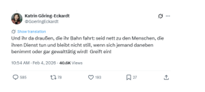 Der 4. Februar war jedoch ein Tag ganz besonderer Kreativität im Leben der berufserfahrenen Vizepräsidentin. Kurz vor ihrem kenntnisreichen Post zu Thüringen hat sie bereits ihre Meinung zu einem anderen Thema kundgetan. Es geht um den Zugbegleiter Serkan C., der in einer Regionalbahn von einem Schwarzfahrer während einer Fahrkartenkontrolle zu Tode geprügelt wurde. Göring-Eckardt weiß ihrer geneigten Leserschaft dazu das Folgende mitzuteilen: