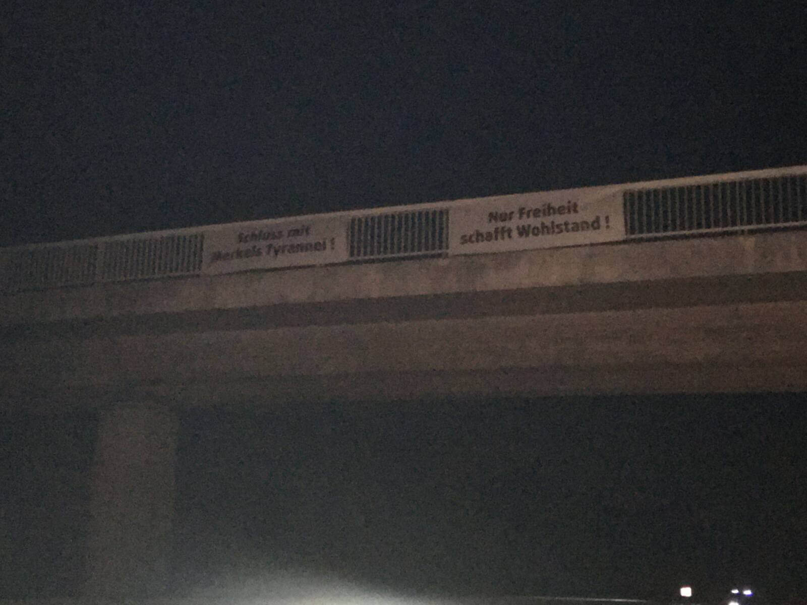 Denn alle paar Kilometer hing ein Transparent an einer Brücke über der Autobahn. Schwarz auf weiß und professionell gedruckt waren da Sprüche zu lesen wie: „Seid ungehorsam!“, „Widerstand ist Bürgerpflicht“, „Letzte Ausfahrt vor der Diktatur!“ oder „Stürzt Merkel!“