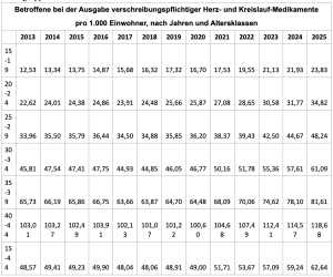 Und nun ist es leicht, die beiden Zahlen über Betroffene zu vergleichen, denn man kann sofort ausrechnen, wie die Zahl pro 1.000 Einwohner lautet. 2013 waren es 22.320/339.585*1000 = 65,72; dagegen liegt der Wert für 2025 bei 32.450/397.621*1000 = 81,61. Da hat sich offenbar einiges getan, und die Frage lautet, in welchen Jahren diese Steigerung aufgetreten ist. Konnte man sie all die Jahre mit einer gewissen Regelmäßigkeit verzeichnen oder wurde sie in einer früheren oder einer späteren Phase beobachtet, während andere Zeiten ruhiger waren? Das lässt sich leicht beantworten, wenn man die beispielhaft angegebene Rechnung für alle Altersgruppen durchführt und in einer Tabelle darstellt.