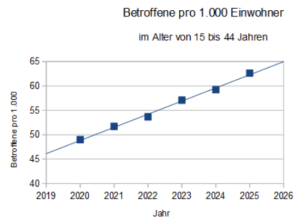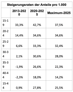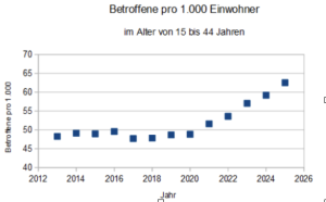 Um noch ein Beispiel zu nennen: In der Klasse von 30 bis 34 hat sich der Anteil der Betroffenen pro 1.000 in den Jahren von 2013 bis 2020 um überschaubare 2,1 Prozent erhöht, in der Zeit von 2020 bis 2025 dagegen um stattliche 30,6 Prozent, während die Steigerung vom bisherigen Maximalwert bis zum Wert von 2025 immer noch 28 Prozent betrug.