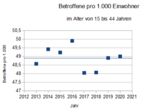 Wie man sieht, werden zunächst die Werte für die sechs Fünf-Jahres-Klassen aufgelistet, die dann in der letzten Zeile durch die Gesamtwerte für alle Betroffenen zwischen 15 und 44 Jahren ergänzt werden.