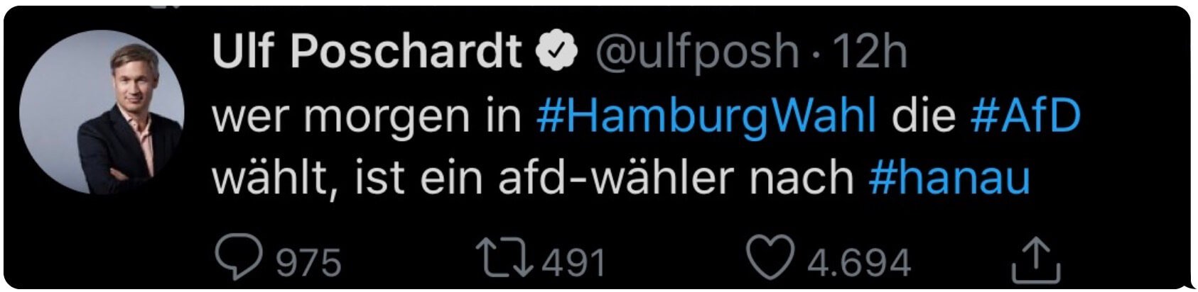 Nach einer Umfrage des Instituts Kantar sieht eine Mehrheit der Deutschen eine Mitverantwortung der AfD an rechtsextremer Gewalt. 60 Prozent der Befragten sind dieser Meinung, so die „Bild am Sonntag“ (BamS) herausfand. Nur 26 Prozent glauben nicht, dass die Partei mitverantwortlich ist für Gewalttaten wie in Hanau, 14 Prozent sind unentschlossen. Auch wenn solche Umfragen mit Vorsicht zu genießen sind, weil sie heute oft genug verwendet werden, um Stimmungen zu schüren statt sie wiederzugeben, ist dies doch ein Indiz dafür, dass die massive Stimmungsmache verfängt.