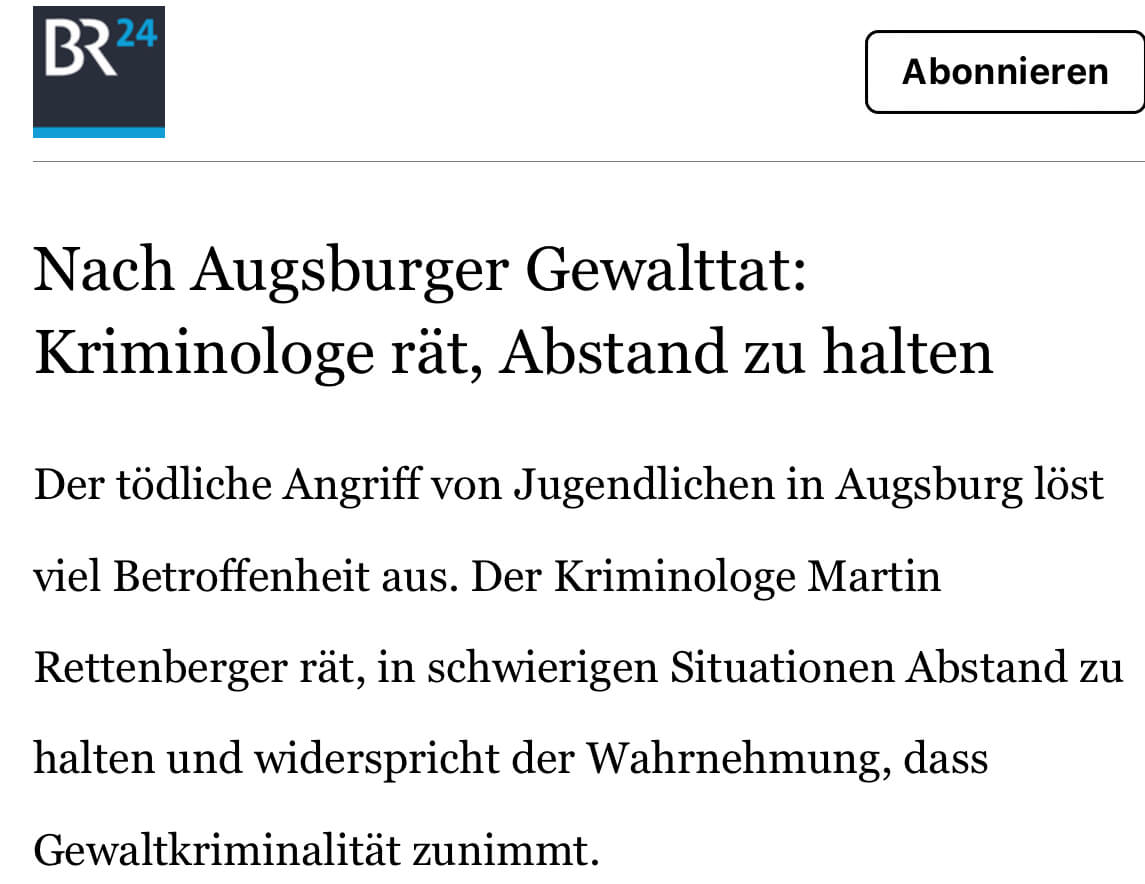 Von Boris ReitschusterWelche Konsequenzen müssen unsere Gesellschaft, vor allem Politik und Medien, aus der Tragödie von Augsburg ziehen? Sie müssten endlich ihre Tabus überwinden und die Probleme mit Gewalt, die überall ins Auge stechen, nicht weiter regelmäßig als „Einzelfall“ abtun und klein reden. So bewußt mir leider ist, dass dies kaum geschehen wird – so sträflich fände ich es, deswegen zu schweigen. Das würde Mitverantwortung bedeuten.