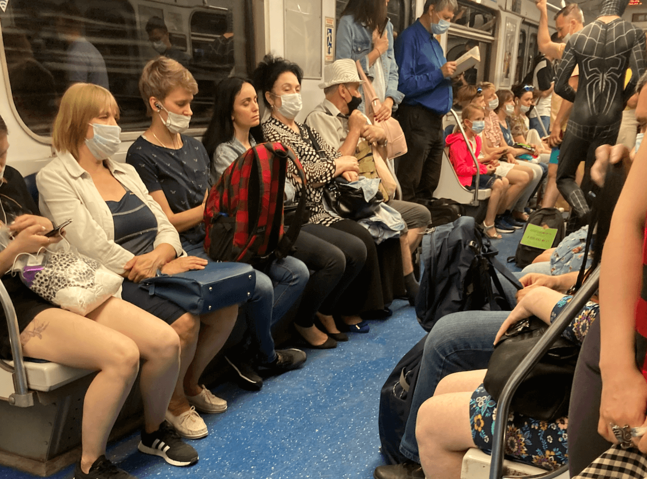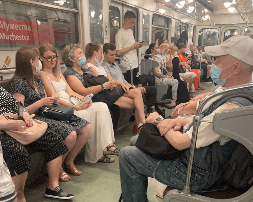 Zwar herrscht an öffentlichen Orten wie in Verkehrsmitteln und Einkaufszentren Maskenpflicht (mit einer Strafe bei Nichtbefolgung von 4.000 Rubel = ca. 46 Euro), dennoch wird sie häufig ignoriert oder nicht wirklich umgesetzt, was ich täglich in St. Petersburg selbst erlebe. Zudem spielt weder die Art der Maske eine Rolle noch wie sie getragen wird. Die meisten Menschen tragen ihre Maske unter dem Kinn oder unter der Nase.