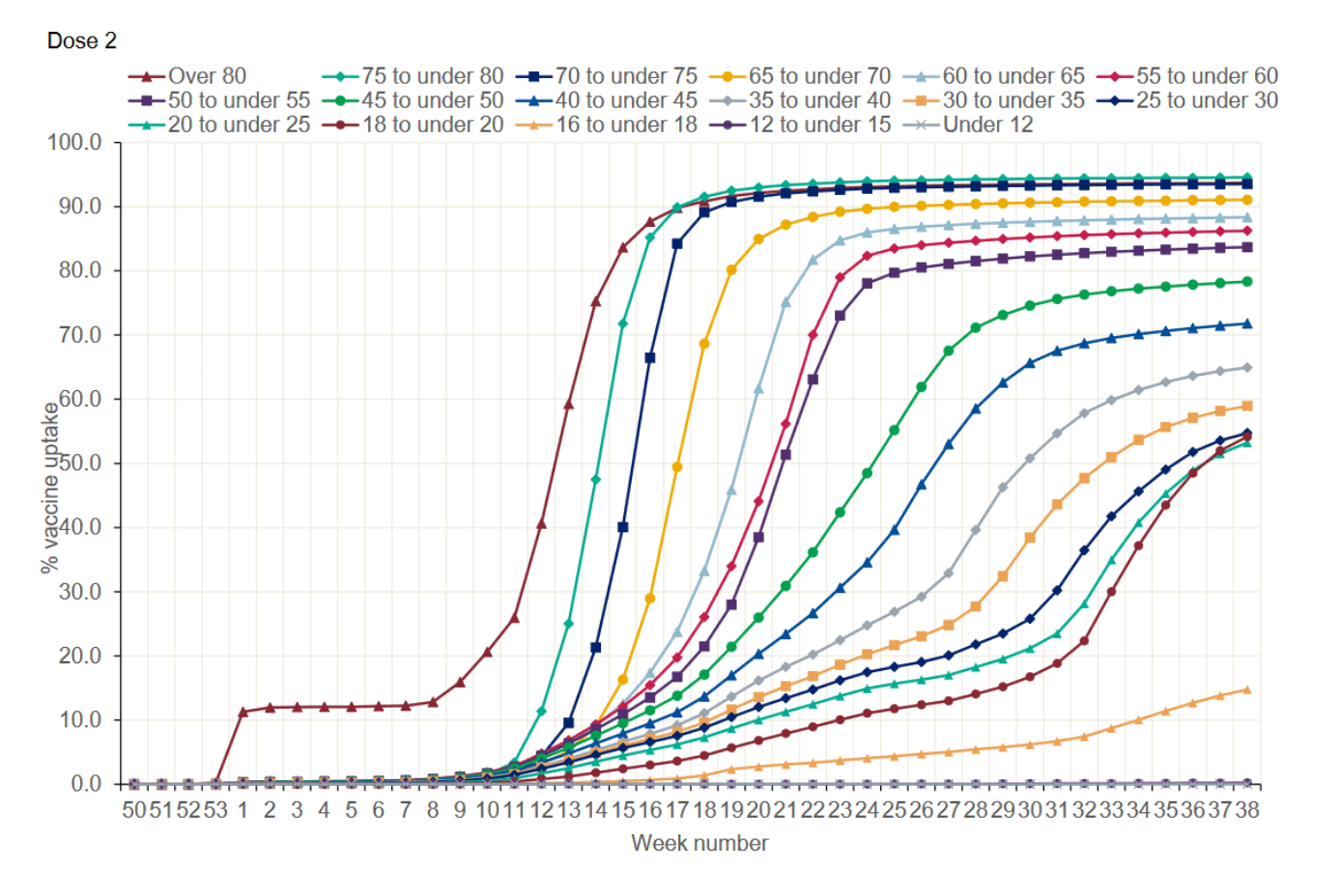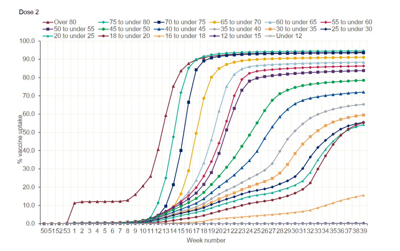 Nur ungern verlässt man sich auf die Daten des RKI, das schon im Zusammenhang mit Zählweisen und Impfquoten seine überschaubare Zuverlässigkeit und Gründlichkeit unter Beweis gestellt hat. Stattdessen schadet es nichts, einen Blick auf die britischen Daten der UK Health Security Agency zu werfen. Im dortigen Impf-Überwachungs-Report vom 30. September findet man die folgende Graphik, in der, aufgeteilt nach Altersstufen, die Impfabdeckung eingetragen ist.