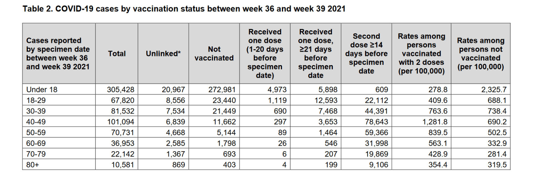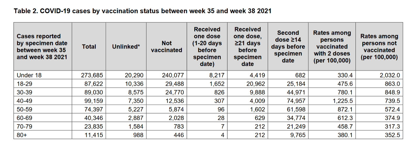 Pro Altersstufe wird hier die Gesamtzahl der Fälle, wie üblich gemessen an Laborergebnissen, in den Kalenderwochen 35 bis 38 angegeben, aufgeteilt nach dem jeweiligen Impfstatus. Spätestens auf den zweiten Blick ist zu sehen, dass man auch in Großbritannien das Publikum nicht durch allzu viel Transparenz belasten möchte. Die Impfquoten wurden nur graphisch angegeben, was die Ermittlung exakter Werte nicht gerade vereinfacht; es wäre ein Leichtes gewesen, auch die konkreten Zahlenwerte in eine Tabelle zu fassen. Und die Aufteilung der Altersklassen in der Tabelle ist eine andere als in der Graphik, sodass aus jeweils zwei Kurven eine kumulative Impfquote ermittelt werden muss. Man muss mit dem zurechtkommen, was geboten wird.