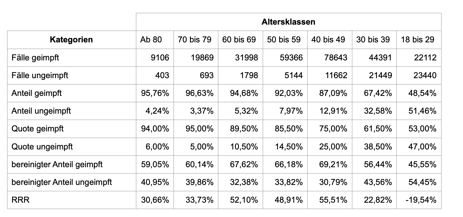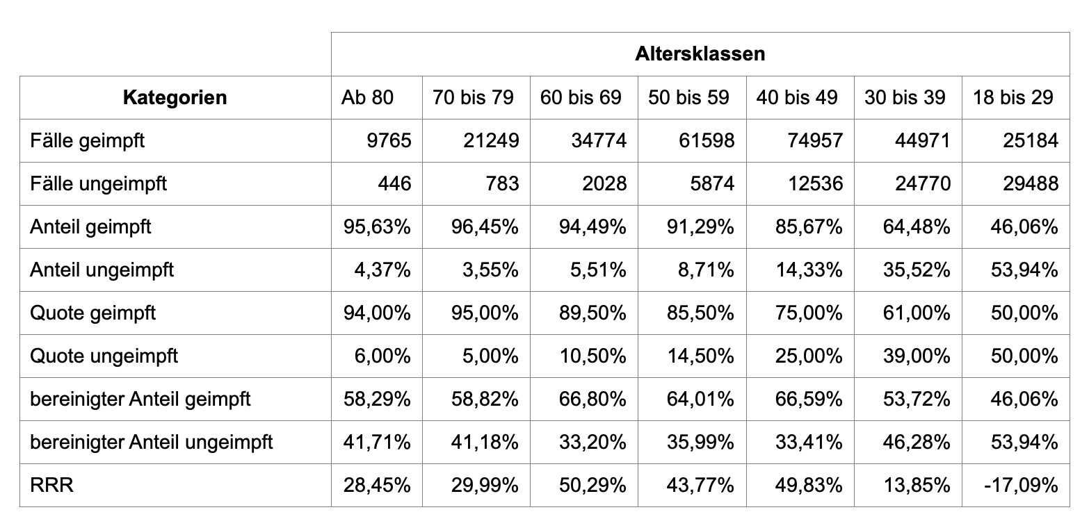Die Ergebnisse sprechen für sich. In allen Altersklassen ab 30 Jahren liegt der bereinigte Anteil der geimpften Fälle über dem der ungeimpften Fälle, teilweise sogar deutlich. Die relative Risikoreduktion bezieht sich auf die Reduktion des Risikos von Ungeimpften im Vergleich zu Geimpften, zu einem positiven Fall zu werden. Man hat also beispielsweise in der Klasse der mindestens Achtzigjährigen als Ungeimpfter ein um 28 % vermindertes Risiko, in die Riege der Infizierten aufgenommen zu werden als der Geimpfte. Erst in der Altersklasse von 30 bis 39 Jahren reduziert sich der deutliche Abstand, um dann in der Klasse von 18 bis 29 Jahren zu einem, wenn auch geringen, negativen Wert umzuschlagen. Natürlich sind diese Werte mit Ungenauigkeiten behaftet, da die Graphik der Impfquoten keine genauen Werte hergibt, aber auch wenn man mit leicht abweichenden Impfquoten rechnet, ändert das nichts am Effekt.