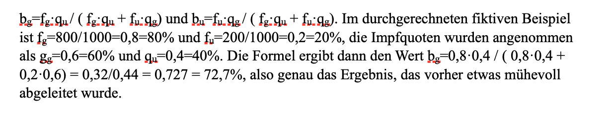 Diese umständliche Prozedur muss nicht jedesmal neu durchgeführt werden. Man kann sie einmal auf abstrakte Weise erledigen und findet so eine einfache Formel, mit der sich die bereinigten Prozentsätze der Fälle – also im Beispiel 72,7 % und 27,3 % – und die relative Risikoreduktion direkt ausrechnen lassen. Dazu muss man die folgenden Werte kennen: den Anteil der vollständig geimpften Fälle (fg) und den Anteil der ungeimpften Fälle (fu) an der Gesamtsumme aus vollständig geimpften und ungeimpften Fällen, die Quote der Geimpften (qg) und die daraus leicht berechenbare Quote der Ungeimpften (qu). Mit den Bezeichnungen bg für den bereinigten Anteil der Geimpften unter den Fällen und bu für den entsprechenen Anteil der Ungeimpften führt eine leichte Rechnung zu den Formeln: