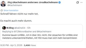 Während der User Siegmund Otter seine Auffassung recht zivilisiert und daher auch völlig zu Recht vorgetragen hat, geht Kachelmann in bewährter Manier wieder einmal aus sich heraus. Ein dummer deutscher Mann kann nur auf der Autobahn „ein Erfolgserlebnis und Überlegenheitsgefühl erleben“, „das er im RL nie erleben könnte.“ Mit RL meint er vermutlich real life oder reales Leben, vielleicht aber auch reines Liebesglück; wer kann das schon wissen in Anbetracht von Kachelmanns kultureller Kompetenz? Und er begründet seine Äußerung in seiner sehr eigenen Logik: „Weil im direkten Gespräch ohne das Vorzeigen der Autowaffe alle sofort wüssten: Oh, ist nur ein dummer deutscher Mann.“