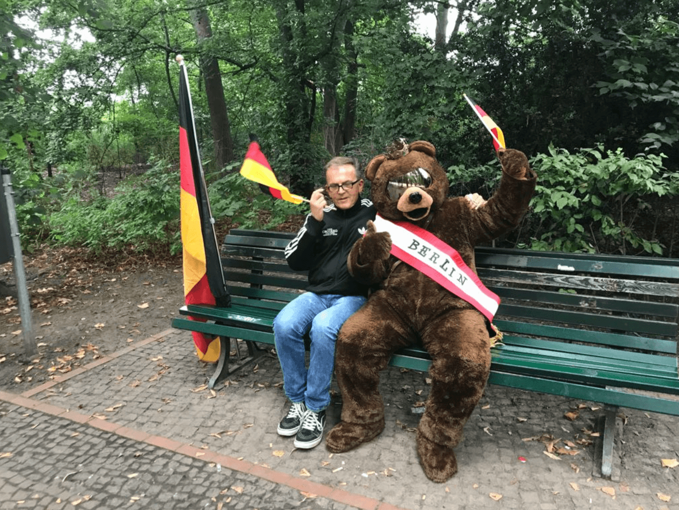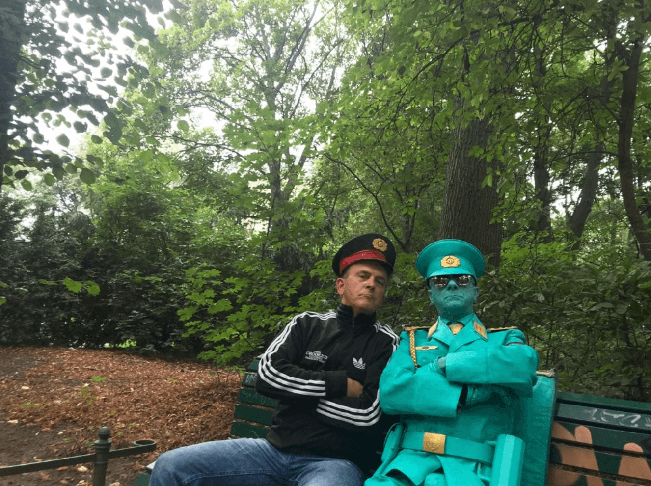 Auf dem Weg zum Brandenburger Tor sitzt ein Berliner Bär mit Deutschlandfahne auf einer der grünen Bänke – ein tollkühner Kritiker mit den Farben des Landes? Weit gefehlt. Er wartet nur auf Menschen, die sich für ein Foto und ein paar Euro zu ihm setzen, so wie der Russe ein paar Bänke weiter, der ganz grün angemalt ist und auch Mützen der NVA und der Sowjet-Armee für ein Foto mit ihm verleiht. Deutschland als Nostalgieangebot, der Bär und der Offizier. Fehlt nur noch der Kasper und die ewige Kanzlerin.