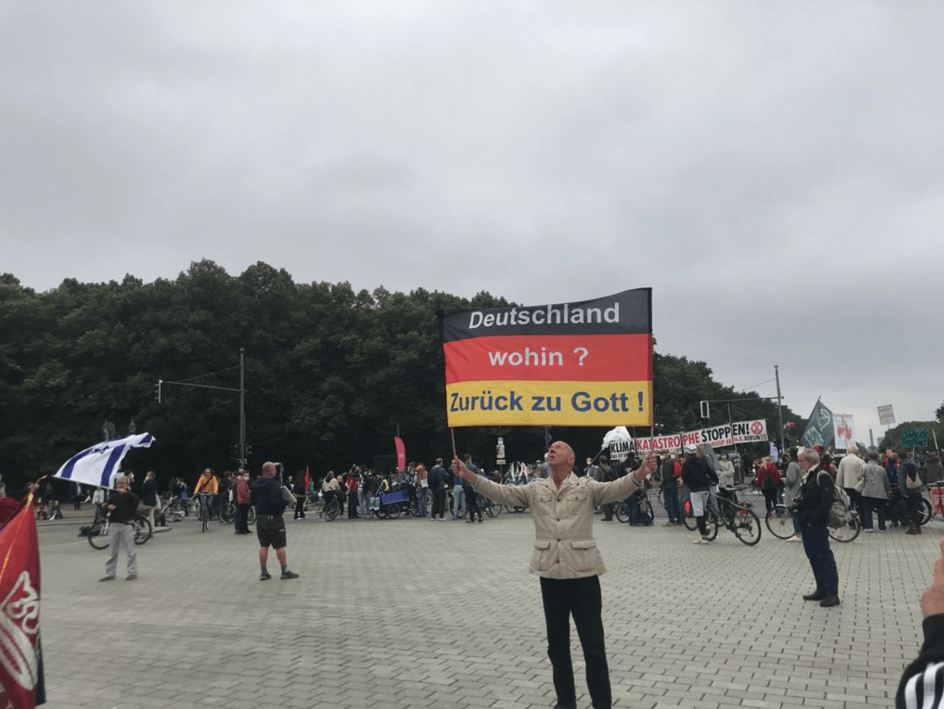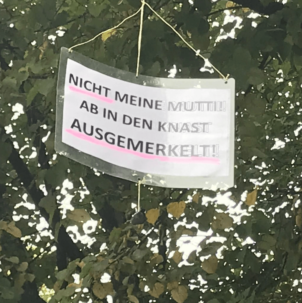 In den Alleebäumen gegenüber vom Brandenburger Tor hängen DIN-A4-Schilder, die Polizei fotografiert schon fleißig die Provokation an diesem rot-rot-grünen Wahlkampftag: „Nicht meine Mutti! Ab in den Knast ausgemerkelt.“ Auf dem Vorplatz zum Tor steht ein alter Mann und hält eine übergroße Deutschlandfahne zwischen seinen Händen. Darauf steht geschrieben: „Deutschland wohin? Zurück zu Gott!“ Das geht hier gerade noch so durch, nur die Deutschlandfahne alleine wäre wohl übel aufgestoßen.