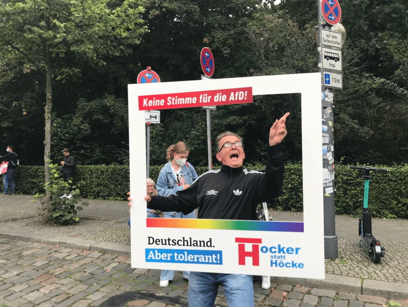 Ein mobiler Stand der sogenannten Seenotretter „Sea-Watch“ läuft zusammen mit der Antifa und bebildert so, auf treffende Weise, die Übereinkunft und Zusammenarbeit. Etwas weiter dann Björn-Höcke-Plakate mit ausgestrecktem rechten Arm „Nie Wieder! Keine Bühne der AfD“ und weitere rot-rot-grüne Adepten halten Rahmen hoch, mit denen sich Teilnehmer fotografieren lassen können. Die Bilder sollen später – so wohl die Idee – online veröffentlicht werden. Auf dem Rahmen aufgedruckt: „Keine Stimme für die AfD!“ Und: „Deutschland aber tolerant!“