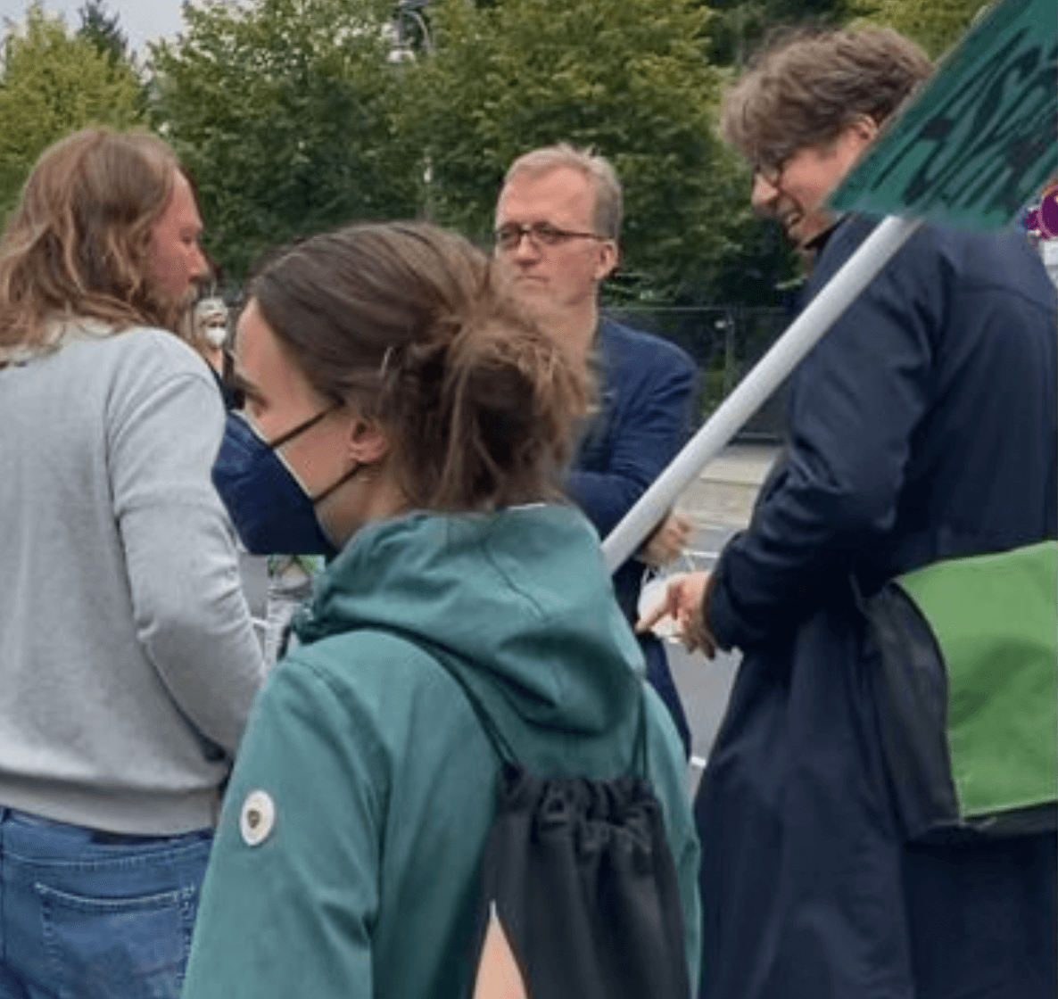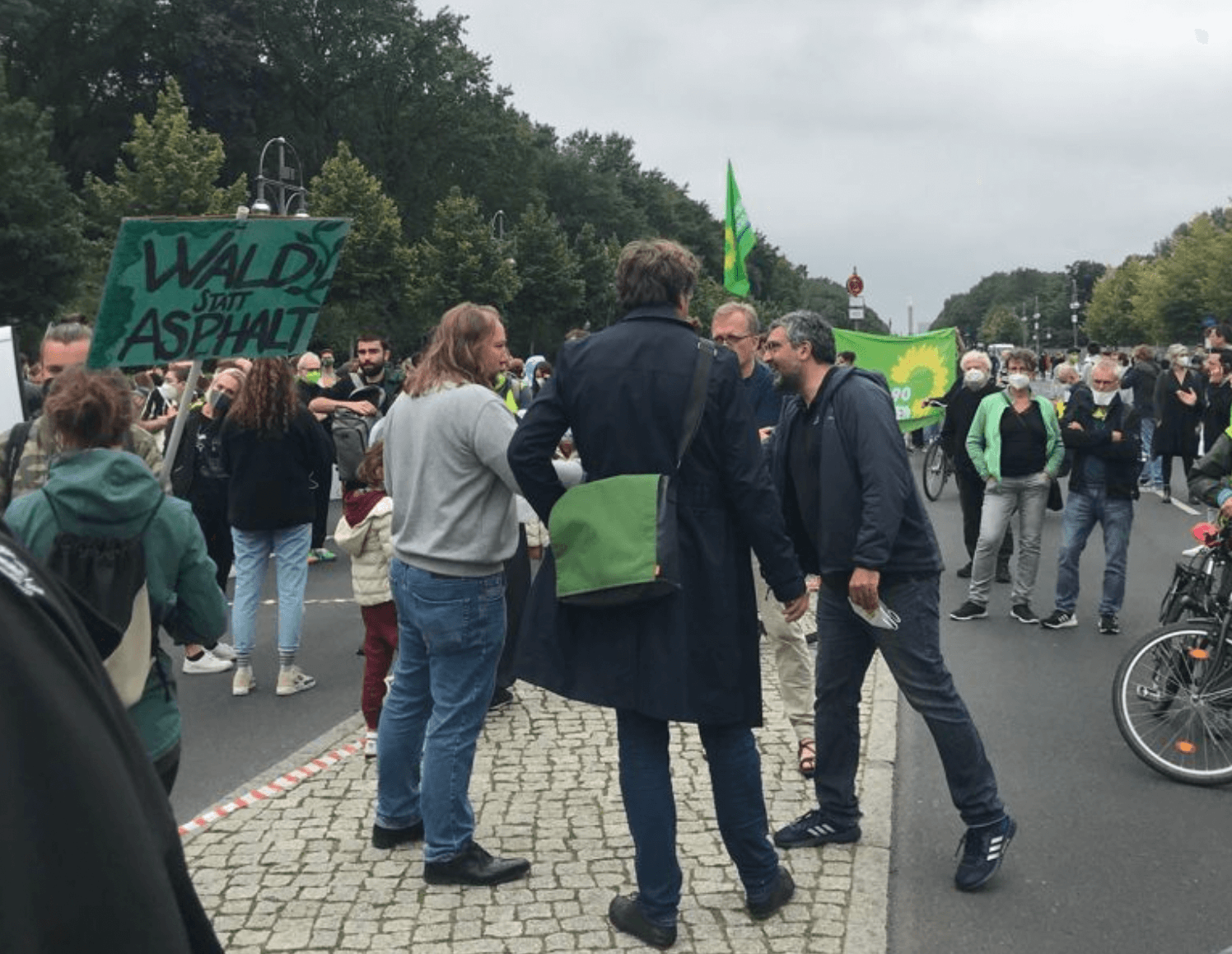 Der Vorsitzende der grünen Bundestagsfraktion trägt Jeans und Pullover, fährt dazu ein schwarzes E-Bike der Marke Kalkhoff. Er entdeckt seine grünen Fraktionskollegen, macht sein Rad an einem Baum fest und gesellt sich dazu. Drumherum stehen Menschen mit FFP-2-Masken. Aber Anton Hofreiter trägt seine Maske nur lässig am Handgelenk, auch seine Kollegen denken gar nicht daran, Mindestabstand zu halten, Maske auch hier Fehlanzeige.