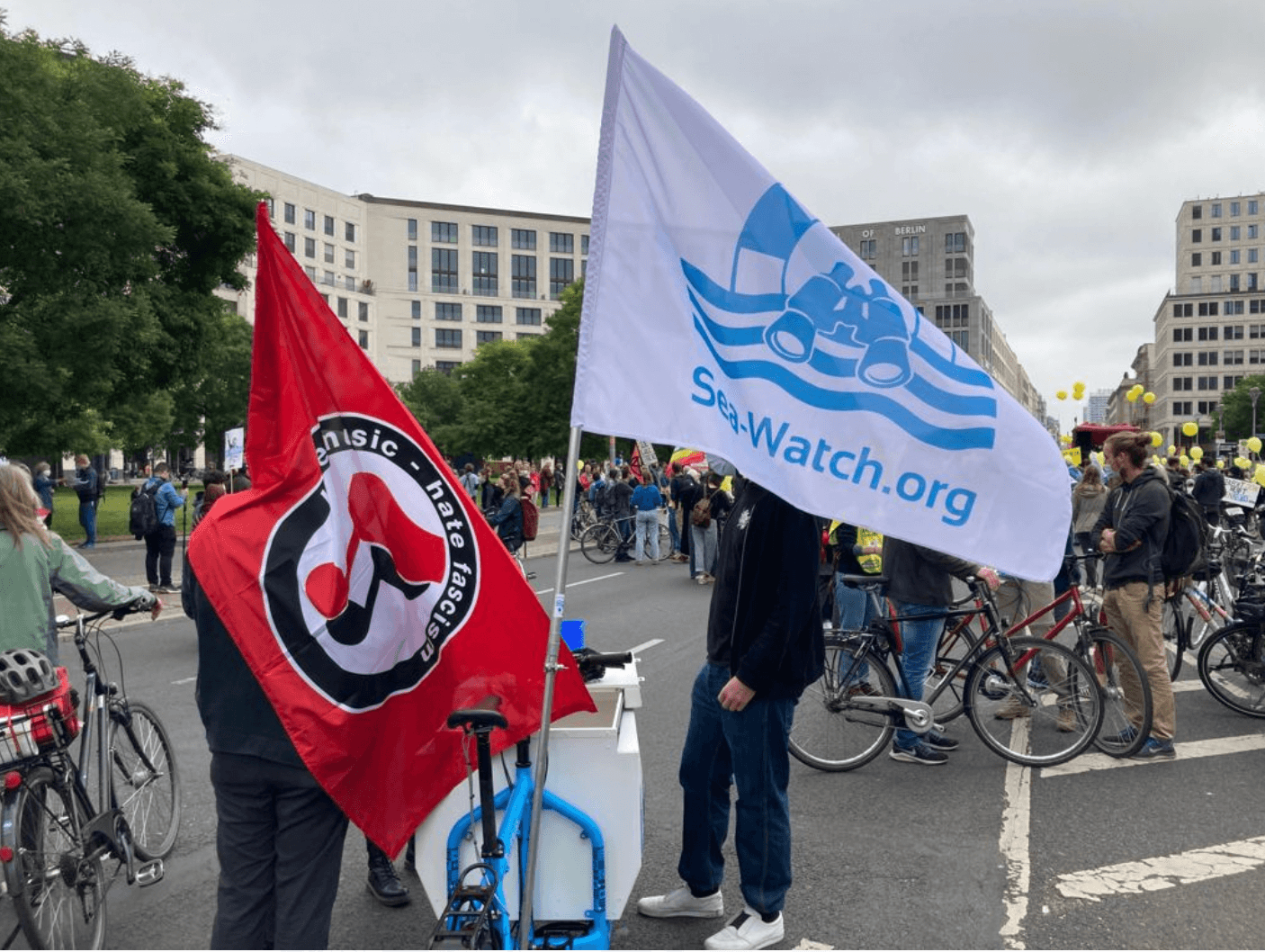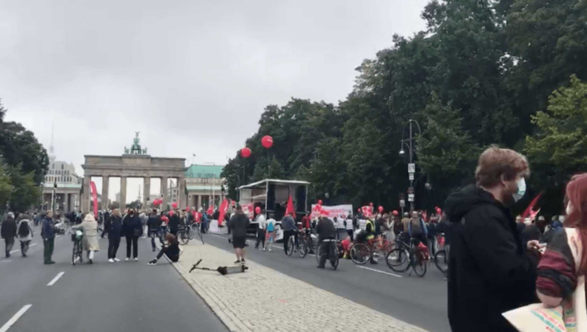 Ich filme derweil weiter, will gerade diese gähnende Leere zwischen den Ständen von Rot-Rot-Grün und den Nichtregierungsorganisationen filmen, da kommt ganz locker und ohne Personenschutz, den Casco-Helm nur pro forma am Arm hängend, der Bundestagsabgeordnete Anton Hofreiter die Straße des 17. Juni heruntergefahren, er muss kaum ausweichen, bis zum Stand der Grünen stehen auf 250 Meter kaum Leute, die Lücke zu den Linken, die näher zum Tor stehen, ist weit offen.