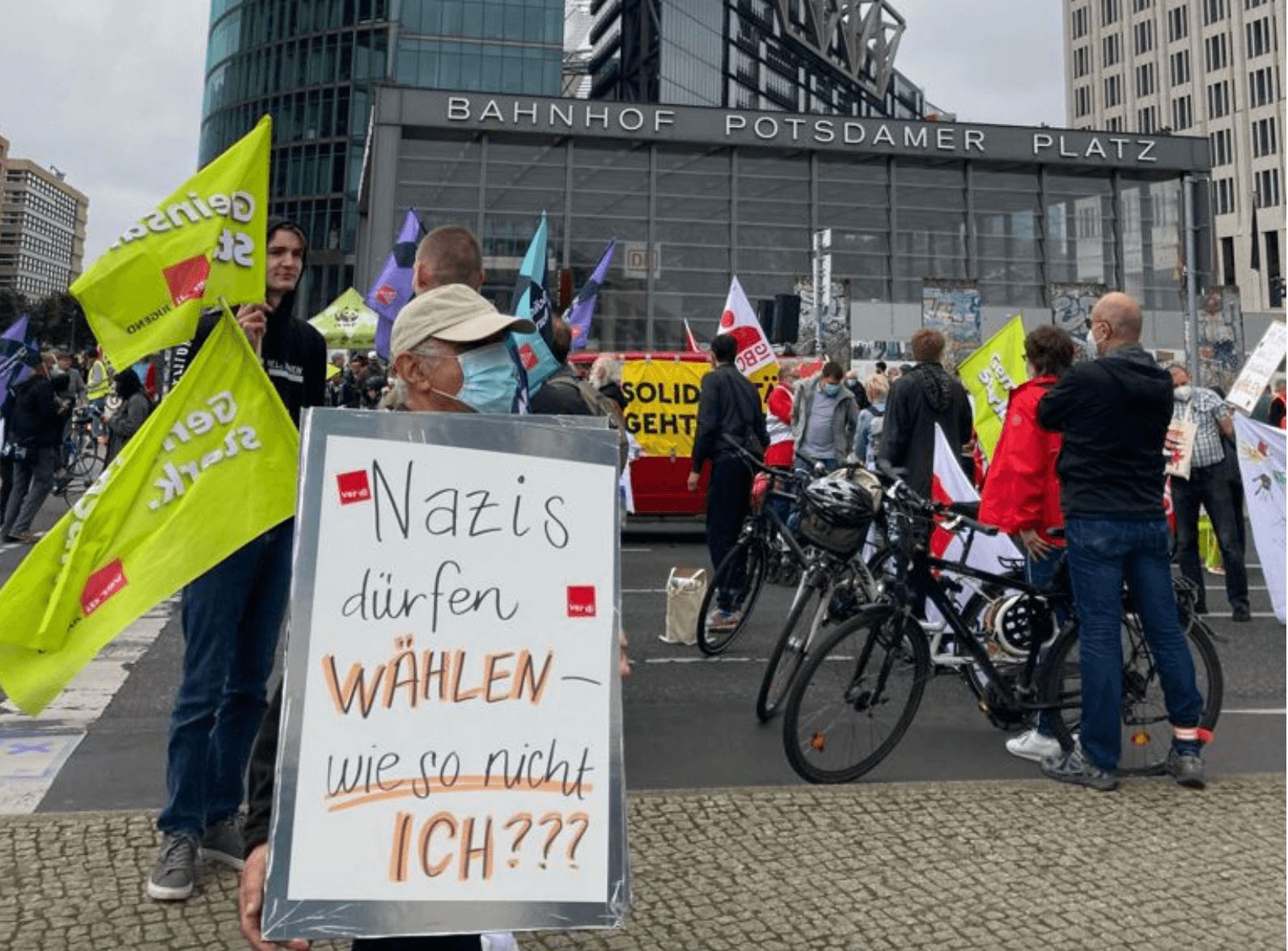 Sie sind zu Hause geblieben. Die Polizei war schlauer, die Einsatzkräfte sind entsprechend gering vertreten, heute wird’s ein ruhiger Tag. Hier demonstrieren keine Regierungskritiker. Es ist eine Demonstration für die Corona-Maßnahmen der Merkel-Regierung, für mehr Zuwanderung, gegen den Kapitalismus, wie eine Perlenschnur reihen sich die Parteien und die Nichtregierungsorganisationen hier auf, als wäre schon Karneval und jeder wollte nur seinen Themenwagen vorführen, aber alle hätten rein aus Versehen das gleiche Motiv gewählt.
