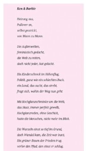 - Das Gedicht bezog sich doch nur auf eine Frau und nicht auf alle. Aber die Gleichstellungsbeauftragte macht gleich einen Kampf gegen alle Frauen daraus. Ziemlicher Unsinn