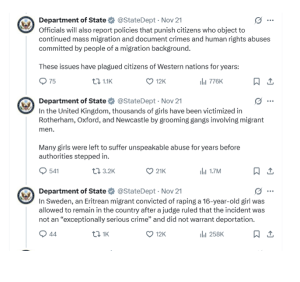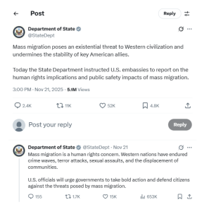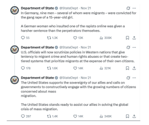 Am Freitag, dem 21. November, veröffentlichte das US-amerikanische Außenministerium, das „Department of State“, auf X eine Reihe von Äußerungen zu den Problemen der Massenmigration, die man im Folgenden in englischer Sprache lesen kann; die deutsche Übersetzung folgt auf dem Fuße.