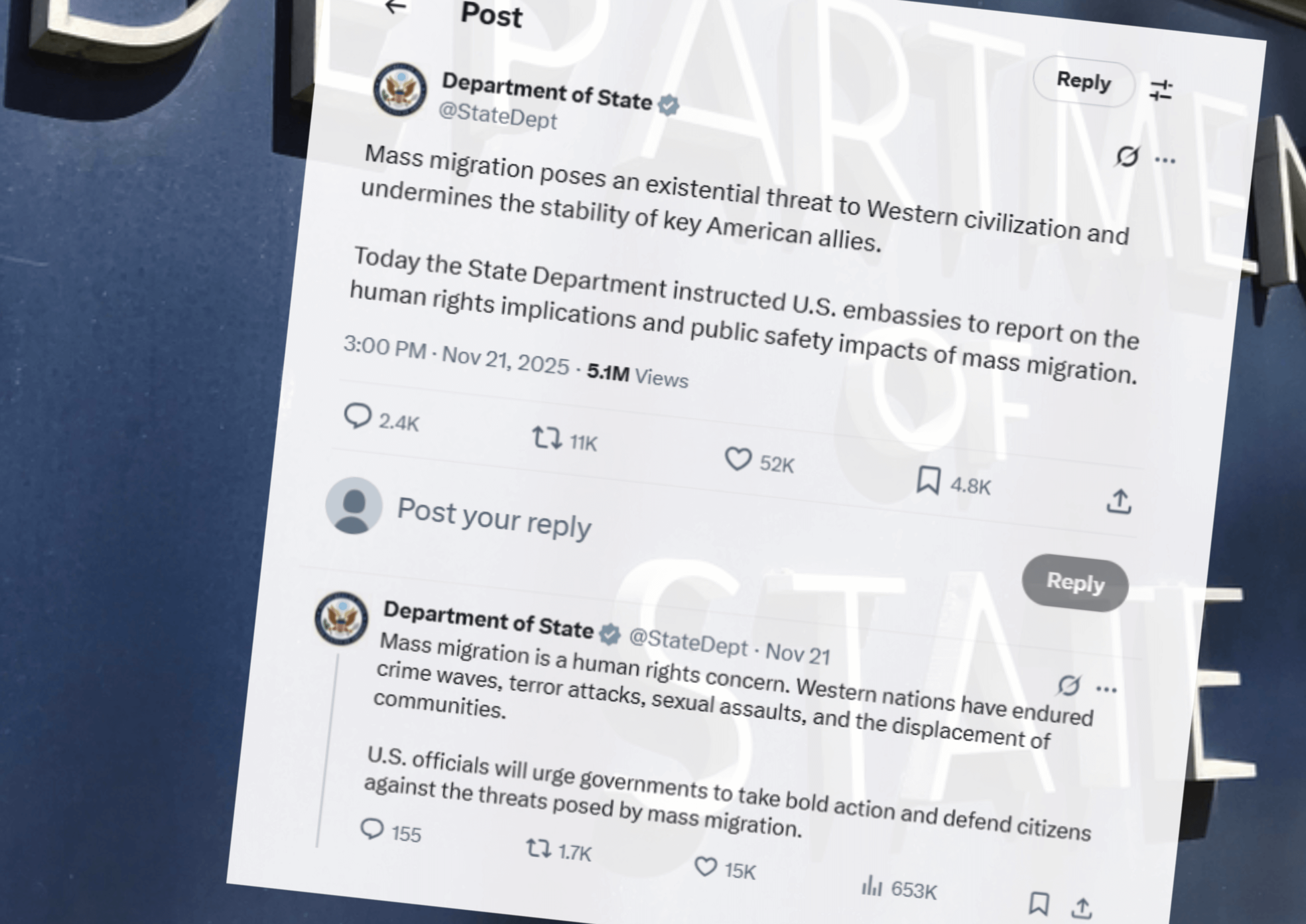 Am Freitag, dem 21. November, veröffentlichte das US-amerikanische Außenministerium, das „Department of State“, auf X eine Reihe von Äußerungen zu den Problemen der Massenmigration, die man im Folgenden in englischer Sprache lesen kann; die deutsche Übersetzung folgt auf dem Fuße.