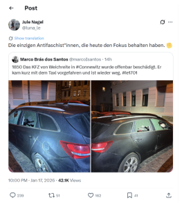 Was haben nun beide miteinander zu tun? Am 17. Januar demonstrierten in Leipzig verschiedene linke Gruppen zur Lage im Nahen Osten und dabei auch gegeneinander. „In Leipzig treffen palästinasolidarische und israelsolidarische linke Gruppen aufeinander“, heißt es im Tagesspiegel, und es ehrt Nagel, dass sie auf der israelsolidarischen Seite gesprochen hat. Anderes ehrt sie nicht. Stefan Weber war vor Ort, um für seinen Kanal über das Demonstrationsgeschehen zu berichten. Als er am späten Abend seinen Wagen wieder erreichte, war er mit eingeschlagenen Scheiben und aufgestochenen Reifen versehen. Das alleine ist schon schlimm genug, und man muss annehmen, dass die polizeilichen Ermittlungen ins Leere laufen werden. Aber Juliane Nagel, die man auch als Jule Nagel kennt, hat auf ihrem X-Account auf diese Tat reagiert.