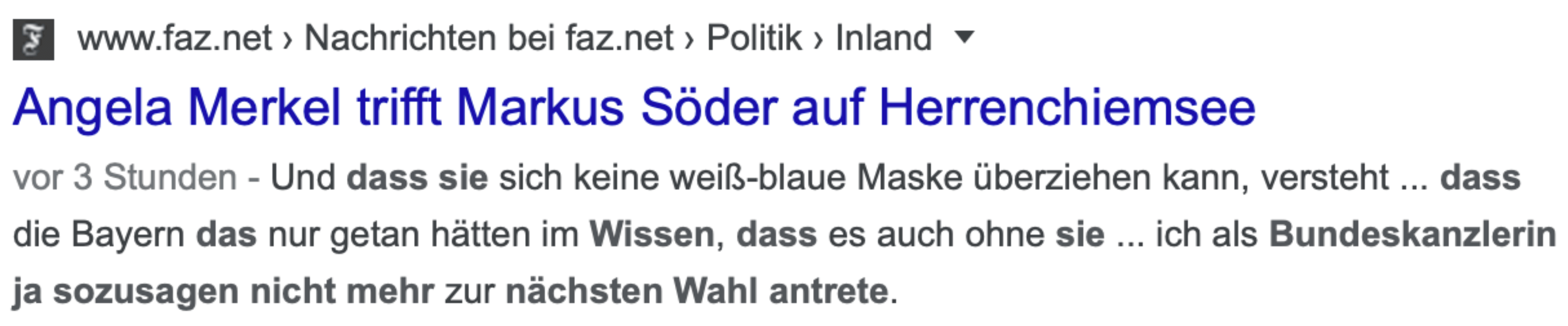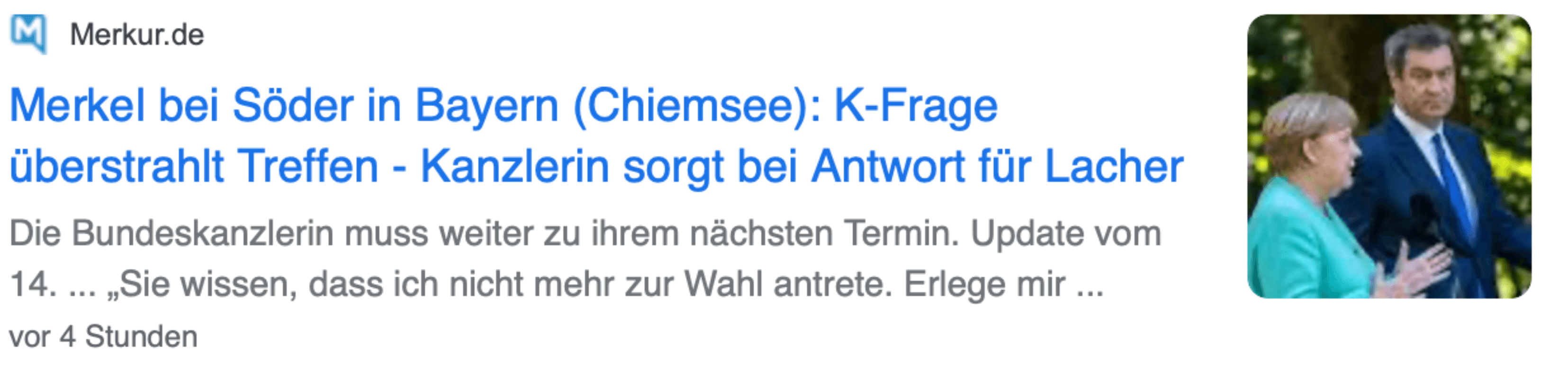 Eine perfide Art der Fragestellung – was aber dem flüchtigen Zuschauer kaum aufgefallen sein wird. Richtig wäre gewesen, zu fragen, ob Merkel eine fünfte Kandidatur ausschließt. Ob sie darüber nachdenkt, ist eine Wischiwaschi-Frage. Und die Antwort – nein, sie denkt nicht darüber nach – ist so verbindlich wie die Reaktion eines notorischen Rasers auf die Frage, ob darüber nachdenkt, mit dem Rasen aufzuhören. Interessant ist, was dann die Nachrichtenagenturen aus der Stelle im Interview machten – und damit die meisten Leser und Zuschauer im Land zu lesen bzw. zu hören bekamen: „Spekulationen über eine mögliche fünfte Amtszeit erteilte Merkel erneut eine klare Absage.“ Genau das tat sie eben nicht.