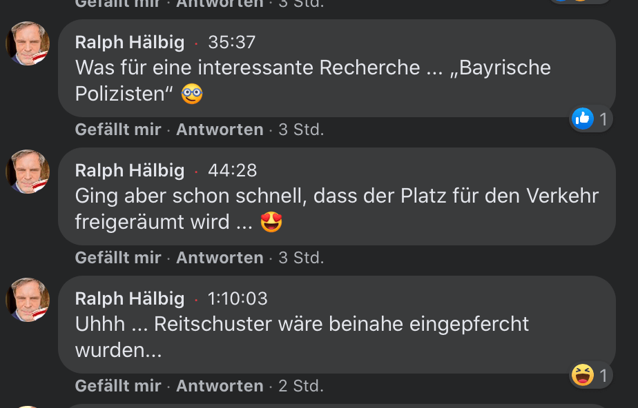 Das ist nur ein kleiner Auszug. Bemerkenswert, dass ein Apparat, der mit acht Milliarden Gebühren von uns allen finanziert wird, es nicht schafft, auch nur einen einzigen Mitarbeiter zu der Auflösung der Demonstration zu senden – dafür aber Mitarbeiter auf infantile Art versuchen, Kollegen zu verspotten, die als Einzelkämpfer genau das kompensieren, worin der riesige Apparat versagt. Die Häme ist sicher ein Zeichen dafür, dass die Nerven blank liegen bei vielen im öffentlich-rechtlichen Apparat.